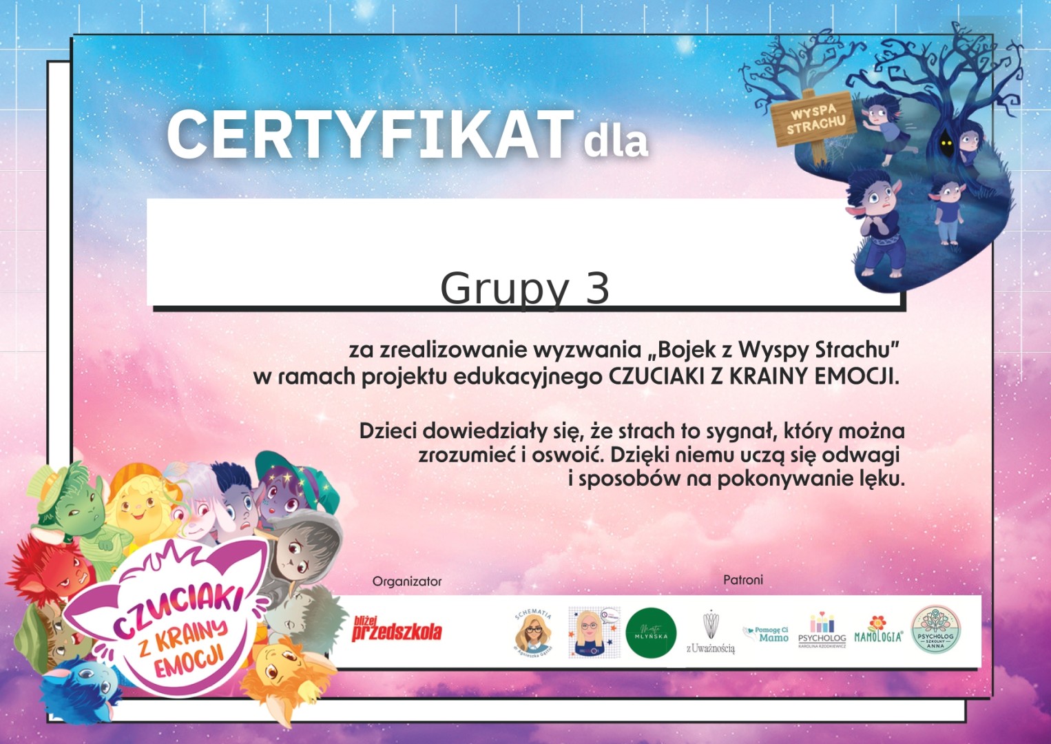 W ramach programu edukacyjnego „Czuciaki z Krainy Emocji” przedszkolaki z grupy 3 poznawały świat uczuć. Dzieci spotkały kolejnego bohatera- Bojka, który pokazuje dzieciom, że strach to sygnał, który można zrozumieć i oswoić. Z nim przedszkolaki uczyły się odwagi i poznały sposoby na pokonywanie lęku.