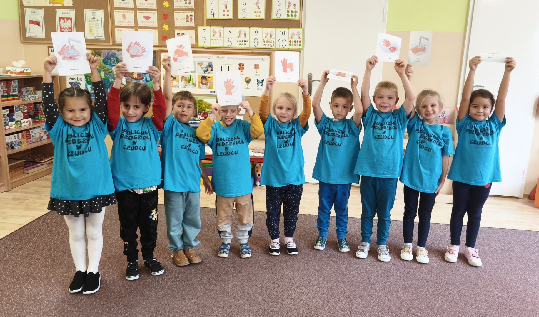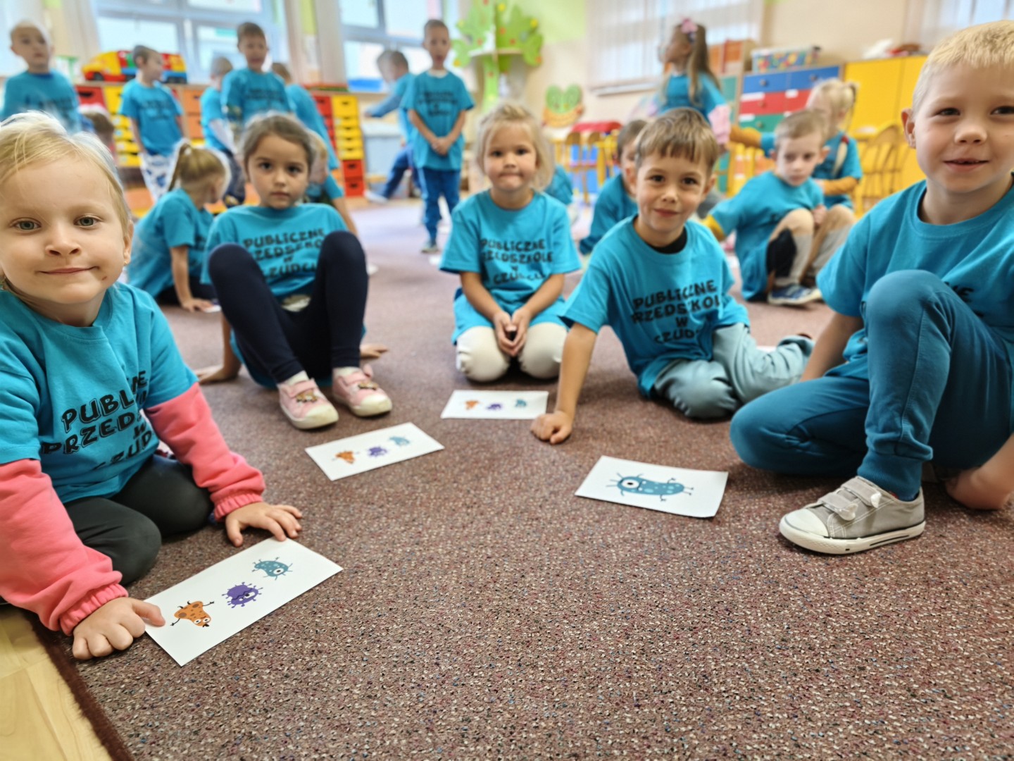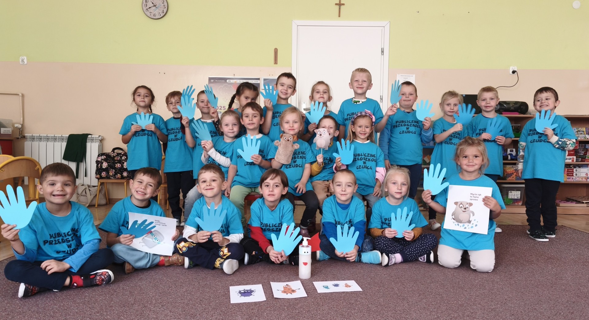 Dnia 16.10.2025r. grupę Muchomorków odwiedził wyjątkowy gość – Pies Łapson z Czyściochowa, z którym przedszkolaki świętowały Światowy Dzień Mycia Rąk! Razem z nim dzieci uczyły się, jak prawidłowo myć ręce. Nasze przedszkolaki na pewno opowiedzą w domu, czego się dowiedziały i jak świetnie się bawiły.