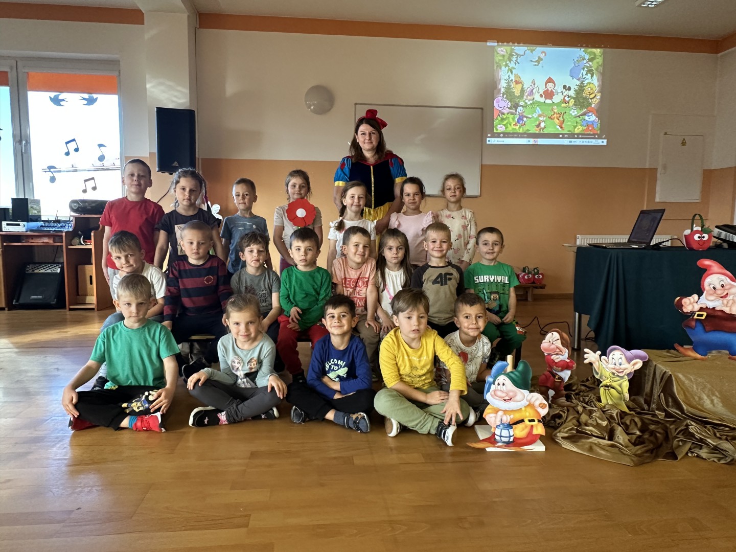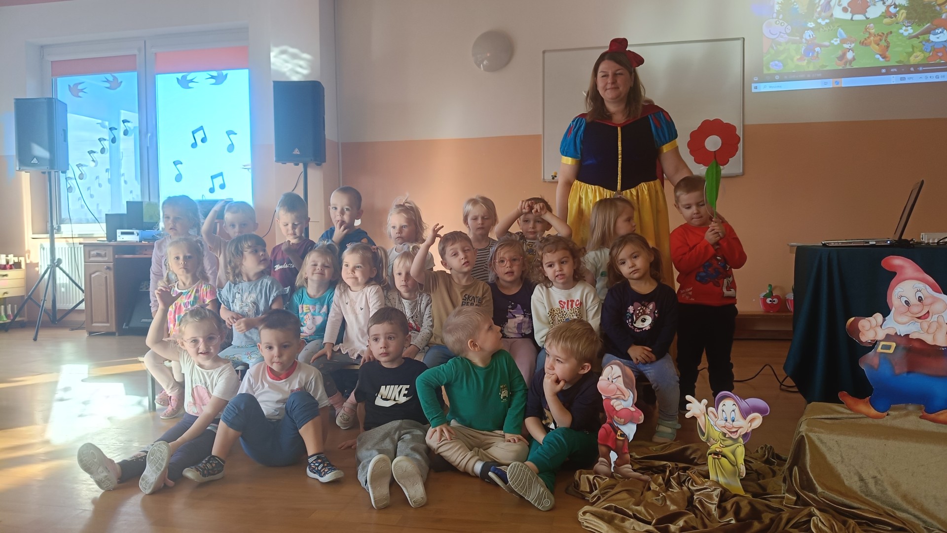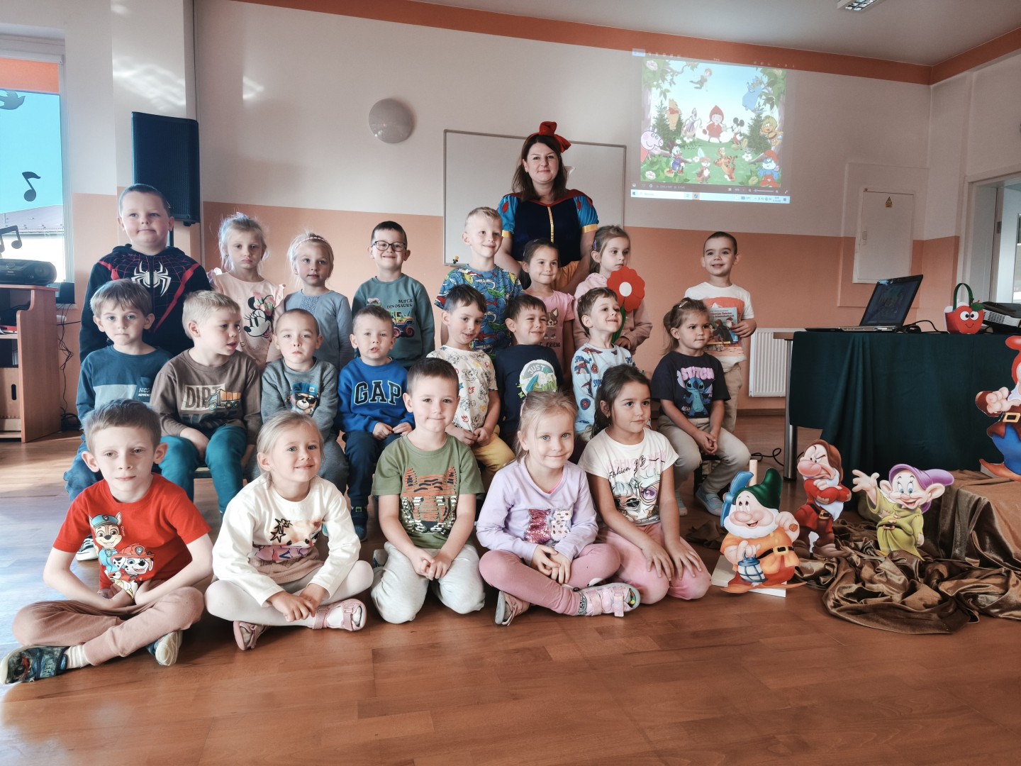 Dnia 4 listopada 2025r. nasze przedszkolaki wzięły udział w kolejnym spotkaniu czytelniczym pn. Głośne czytanie. Tym razem dzieci wysłuchały bajki pt.: „Królewna Śnieżka i siedmiu krasnoludków”. Przedszkolaki z ogromnym zainteresowaniem śledziły przygody królewny i jej małych przyjaciół, a barwne ilustracje pomogły im przenieść się do magicznego świata pełnego czarów, tajemnic i niezwykłych bohaterów. Na zakończenie spotkania dzieci rozwiązywały serię bajkowych zagadek, które dostarczyły wszystkim mnóstwo radości i wspaniałej zabawy. Serdecznie dziękujemy Paniom z Gminnej Biblioteki Publicznej w Czudcu za poświęcony nam czas i słodkie upominki.