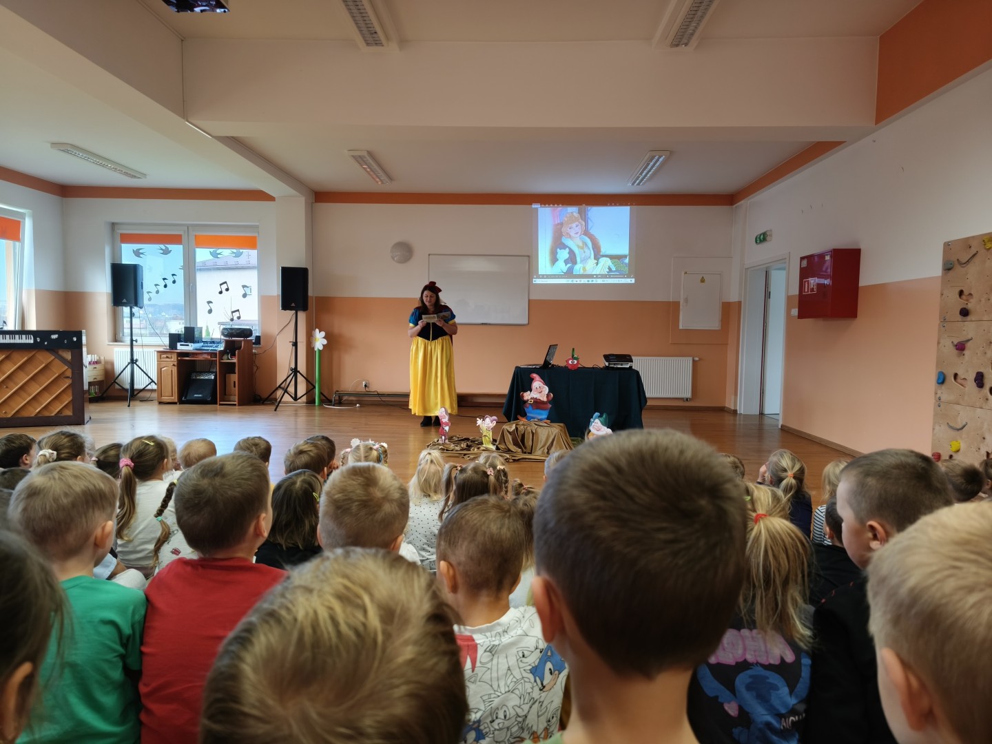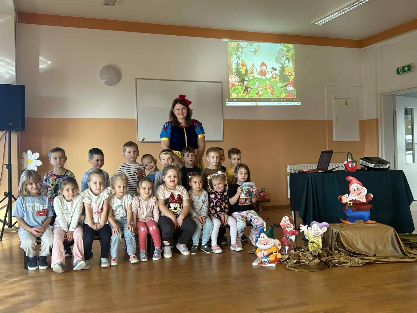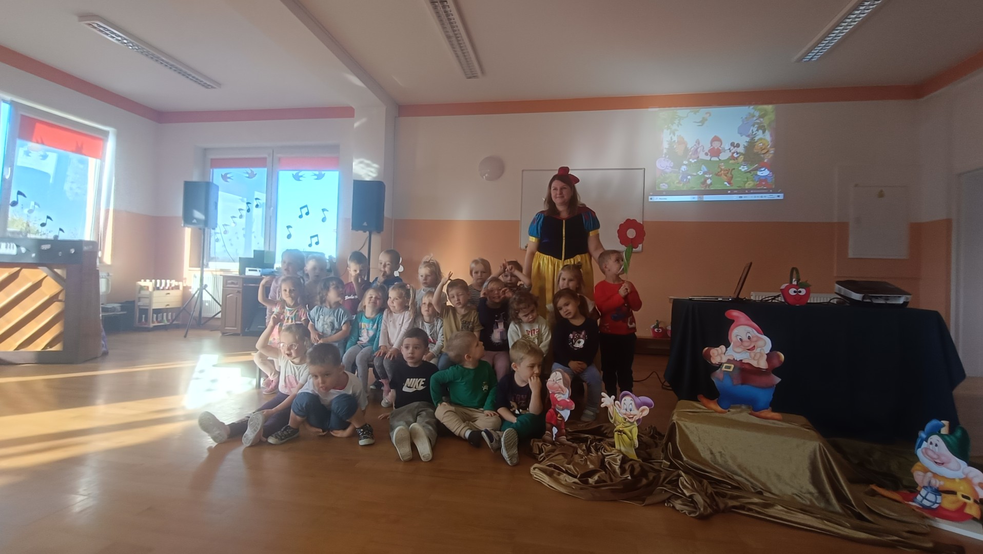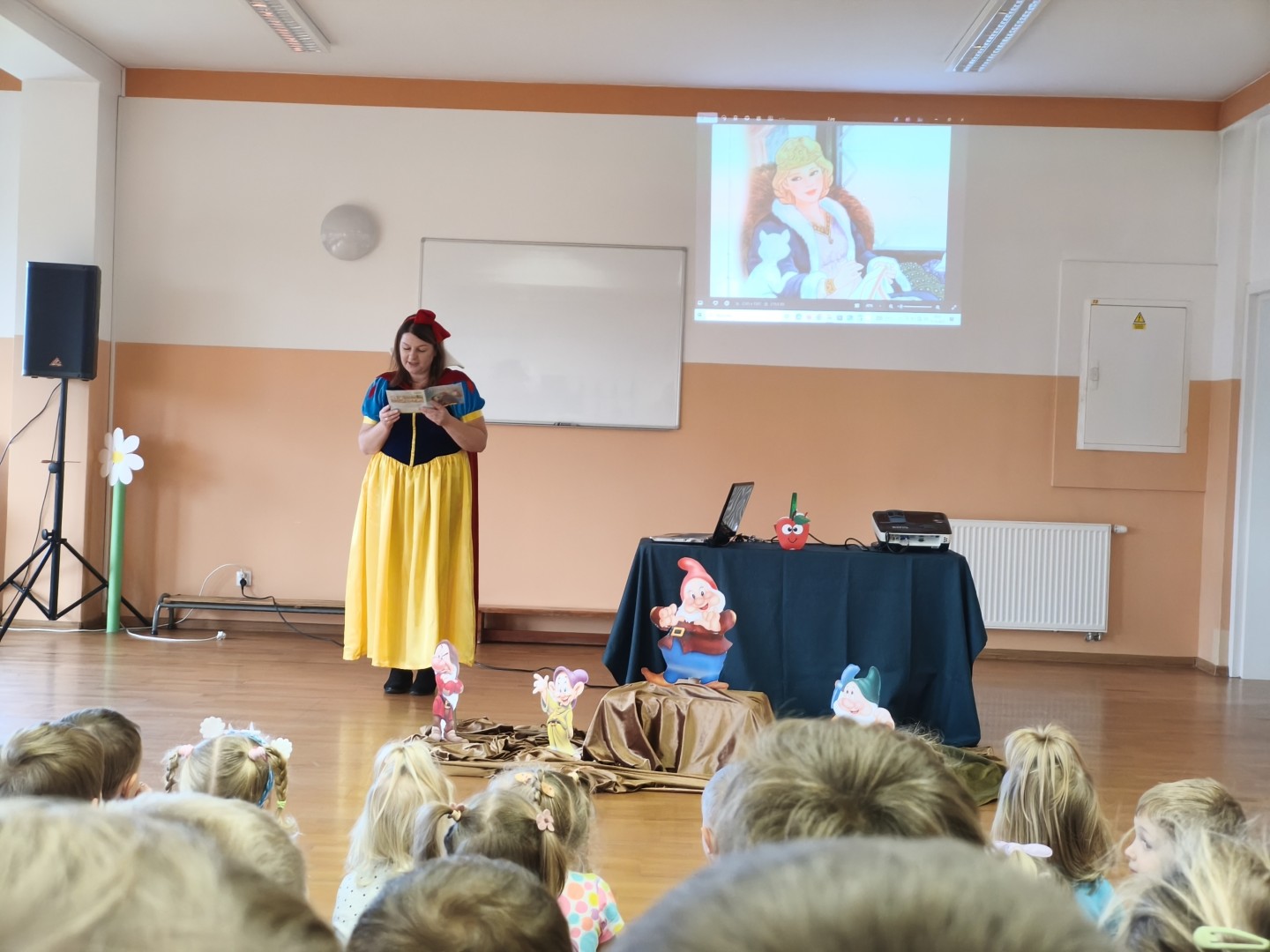Dnia 4 listopada 2025r. nasze przedszkolaki wzięły udział w kolejnym spotkaniu czytelniczym pn. Głośne czytanie. Tym razem dzieci wysłuchały bajki pt.: „Królewna Śnieżka i siedmiu krasnoludków”. Przedszkolaki z ogromnym zainteresowaniem śledziły przygody królewny i jej małych przyjaciół, a barwne ilustracje pomogły im przenieść się do magicznego świata pełnego czarów, tajemnic i niezwykłych bohaterów. Na zakończenie spotkania dzieci rozwiązywały serię bajkowych zagadek, które dostarczyły wszystkim mnóstwo radości i wspaniałej zabawy. Serdecznie dziękujemy Paniom z Gminnej Biblioteki Publicznej w Czudcu za poświęcony nam czas i słodkie upominki.