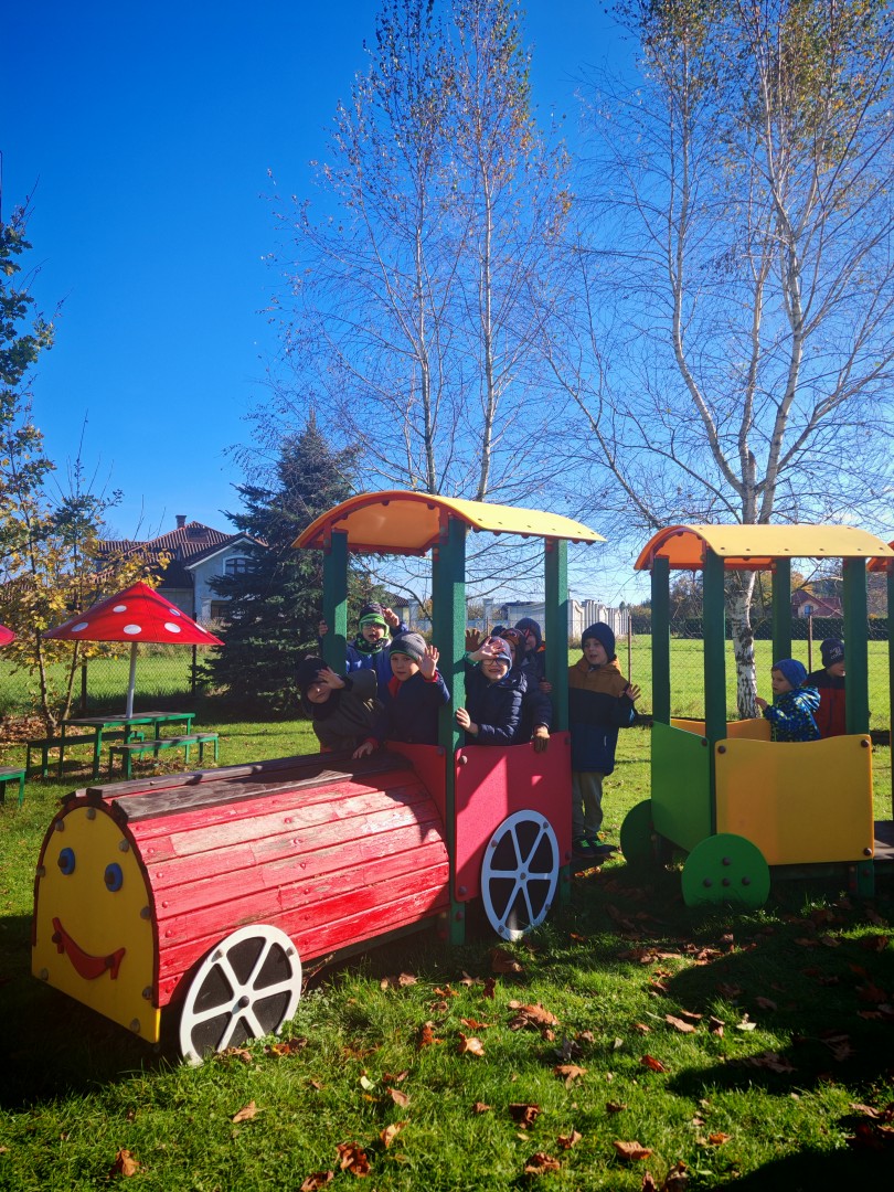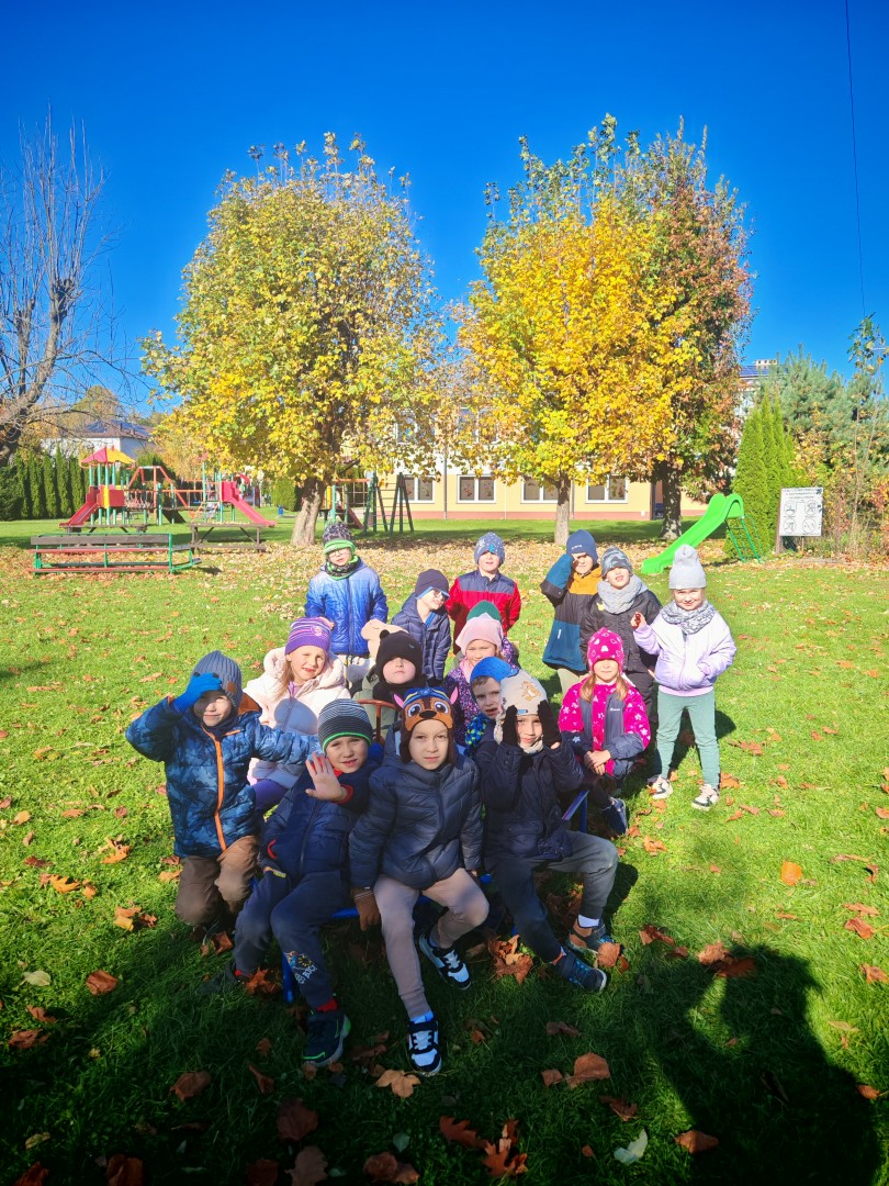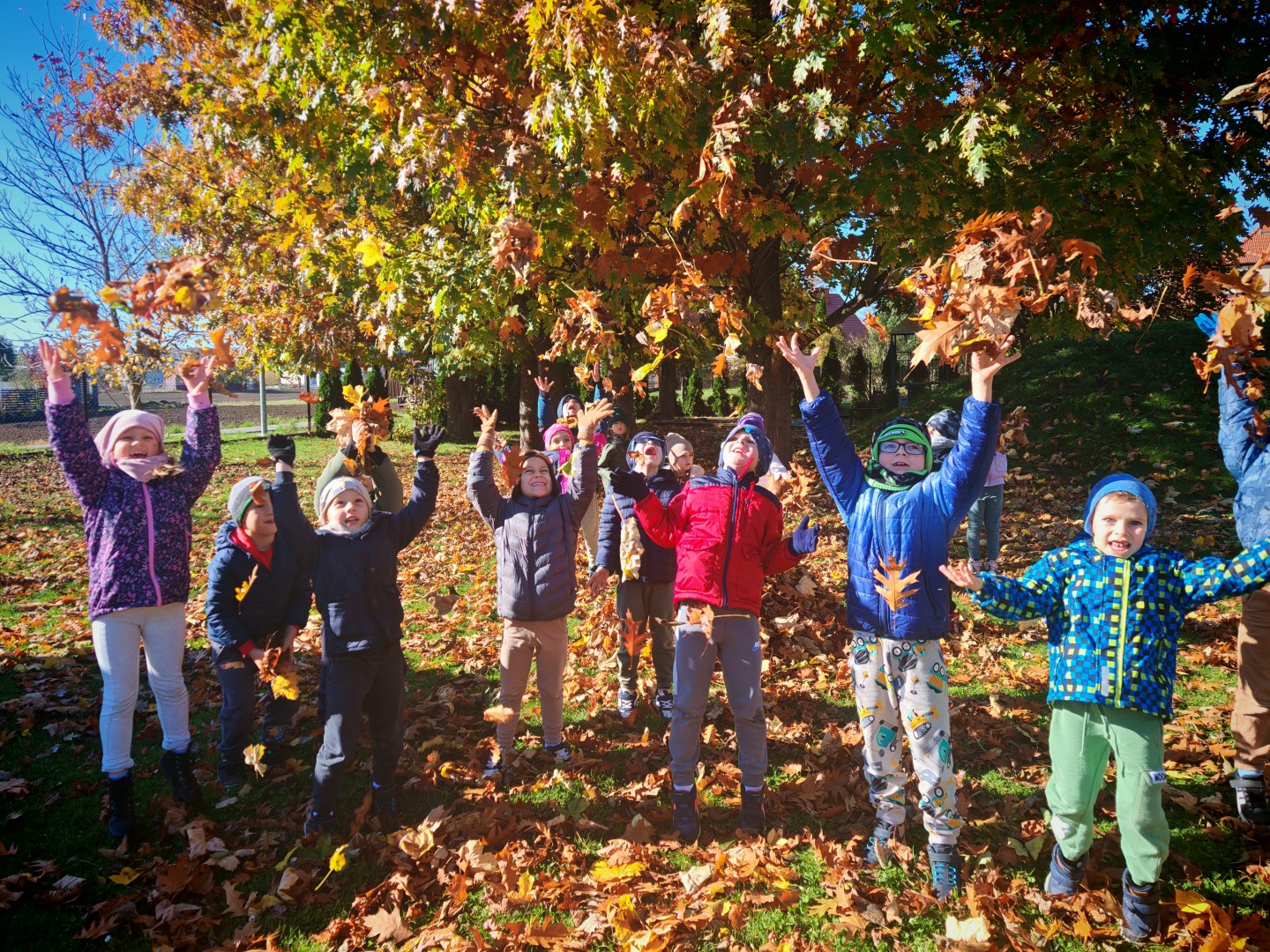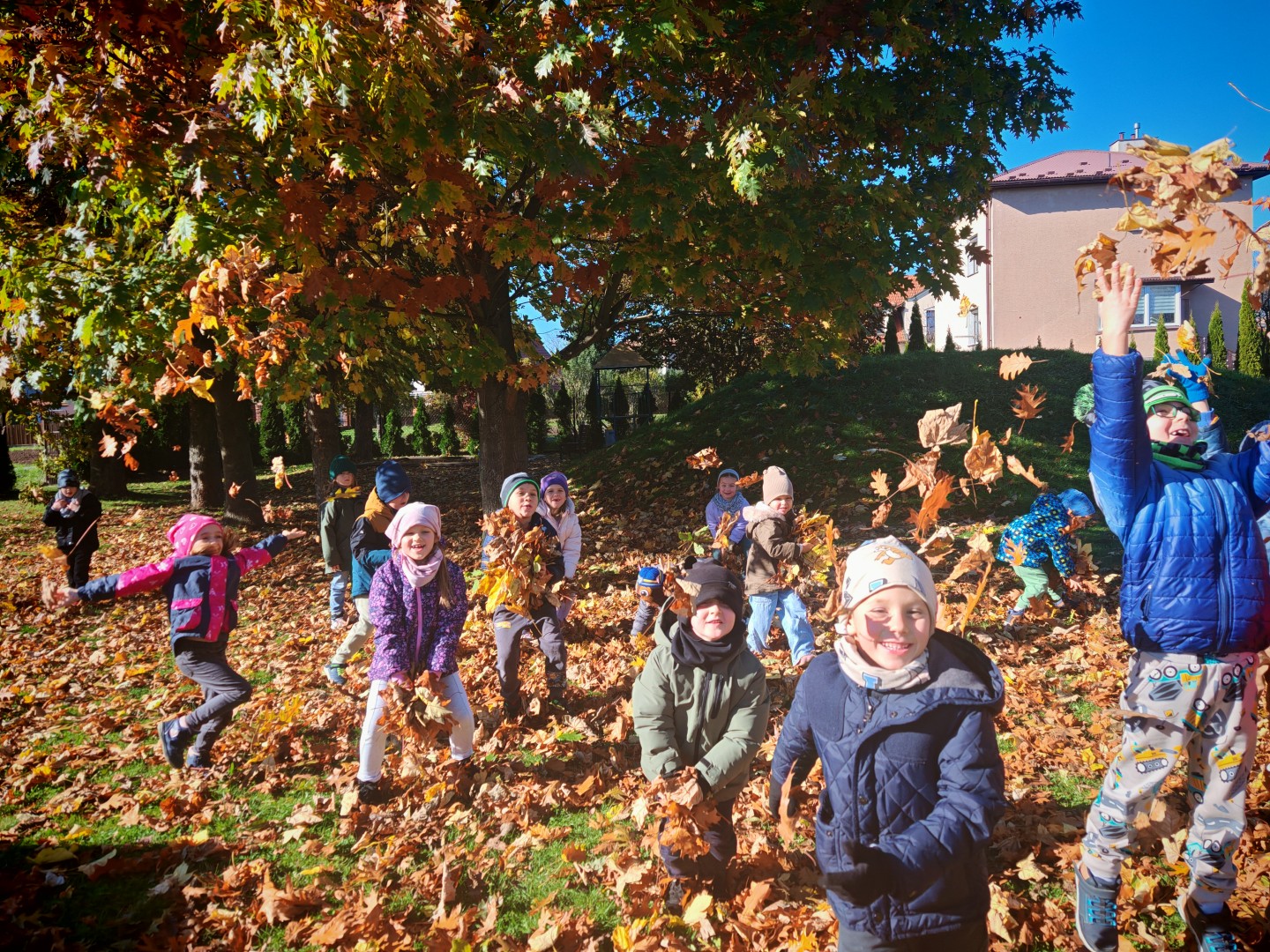 Pobyt dzieci na świeżym powietrzu, jest bardzo ważny dlatego przedszkolaki z grupy Krasnali korzystają z uroków „Polskiej Złotej Jesieni”. Dzieci wykorzystują materiał przyrodniczy do zabaw na placu przedszkolnym. Pod okiem opiekunów, zbierają jesienne liście i kasztany oraz gromadzą je w kącikach przyrody, układają z nich kompozycje. Przedszkolaki stworzyły również domek dla jeżyka i podrzucały liście z okrzykiem „Jesień!”.