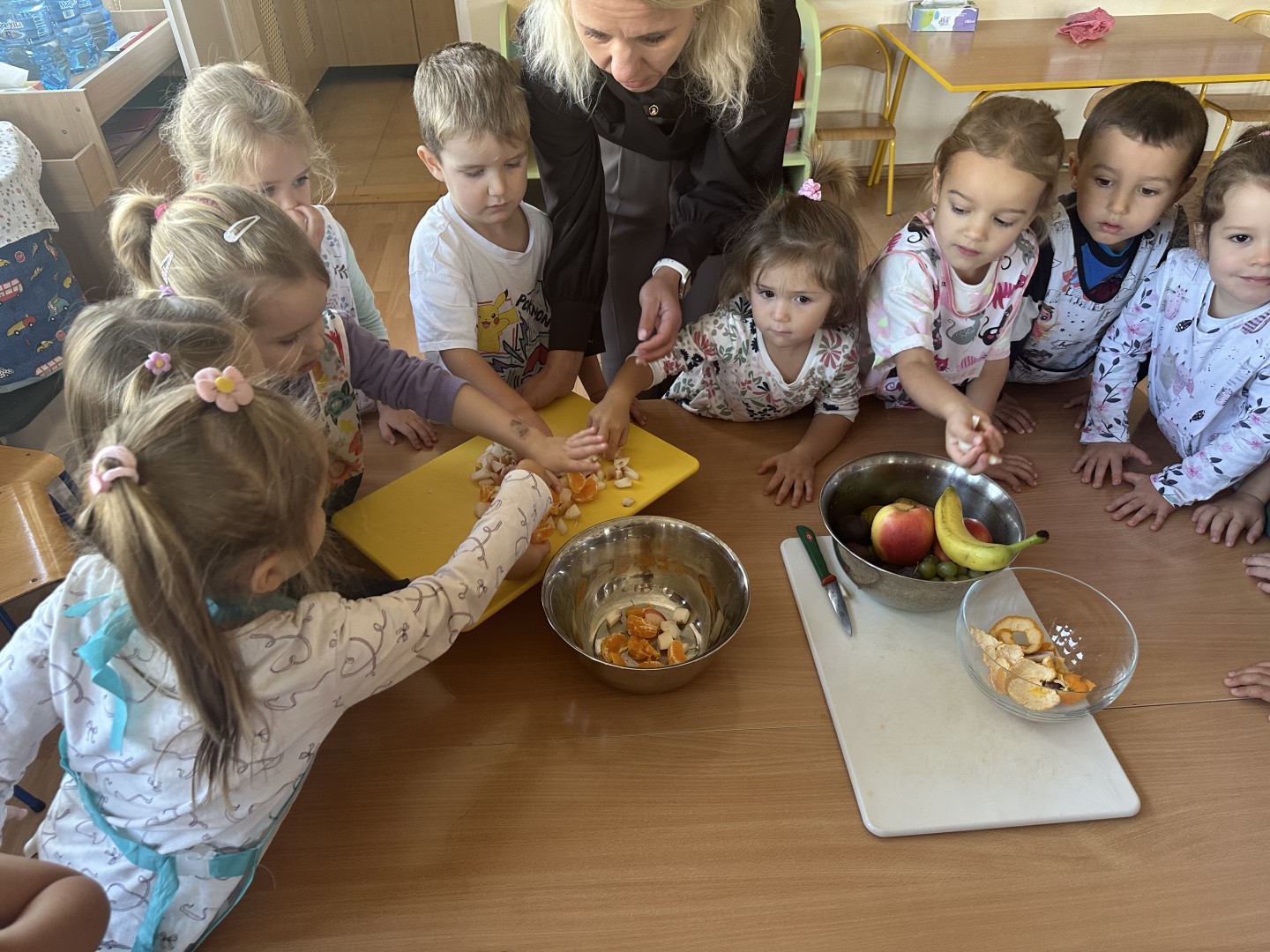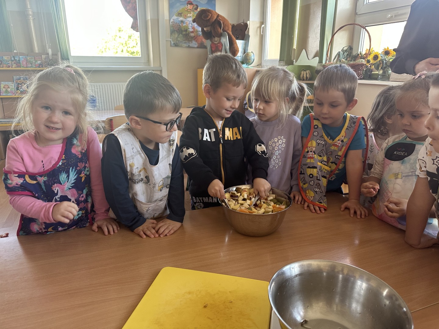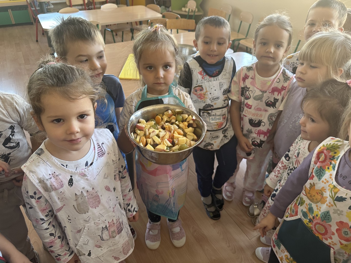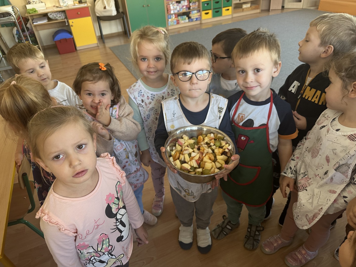 Dzieci z grupy „Kotki” na zajęciach przygotowały pyszną i zdrową sałatkę owocową. Owoców było bardzo dużo. Na stole znalazły się: jabłka, gruszki, banany, brzoskwinie, mandarynki, winogrona i śliwki. Wszyscy mieli soczyste minki na widok tak smakowitych owoców i każdy ochoczo zabrał się do pracy. Na początku dzieci poznały rodzaje owoców, te które występują w naszym kraju i owoce egzotyczne. Następnie rozmawialiśmy o tym co potrzebujemy do wykonania sałatki owocowej. Dokładnie umyliśmy ręce i owoce a następnie zabraliśmy się do pracy. Pani kroiła owoce, a dzieci wrzucały je do miski. Przyrządzenie sałatki dało dzieciom wiele satysfakcji, jednocześnie uświadamiając jak ważną rolę odgrywają witaminy we właściwym funkcjonowaniu organizmu. Sałatka wyszła wspaniale! Dzieci zrobioną przez siebie sałatkę zjadły z apetytem.