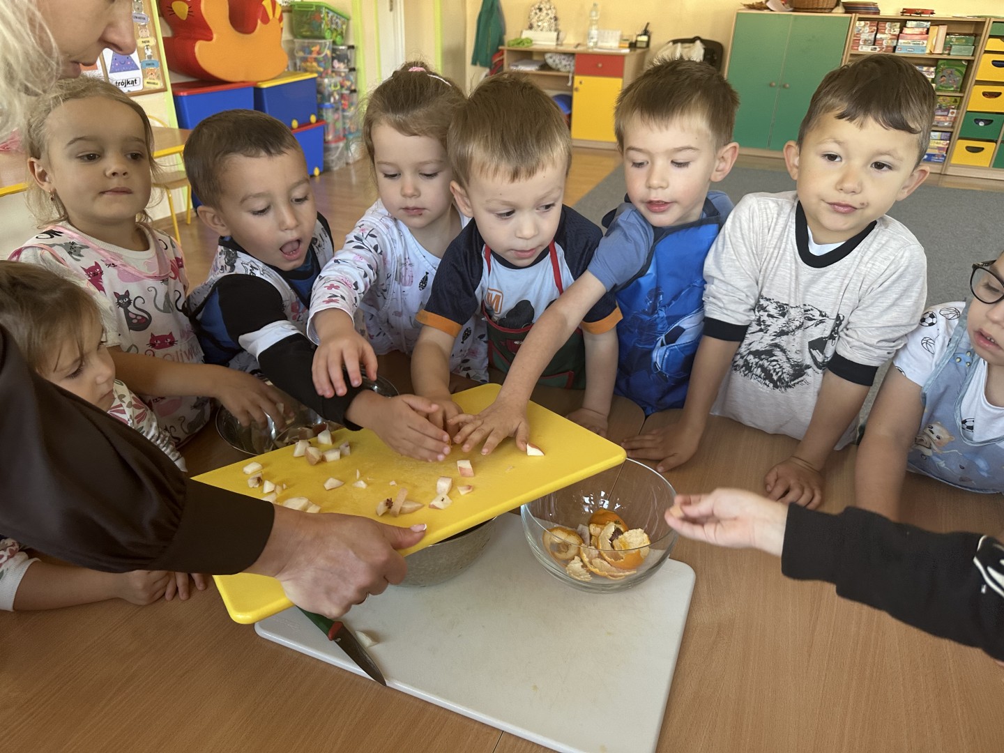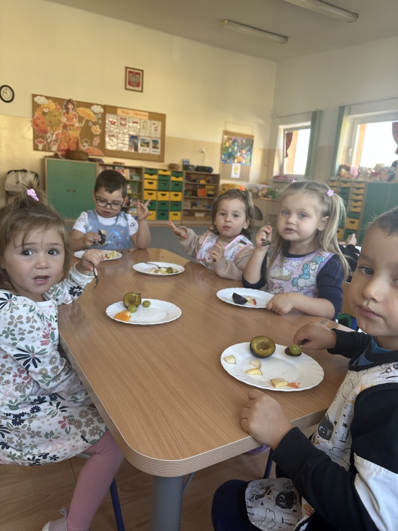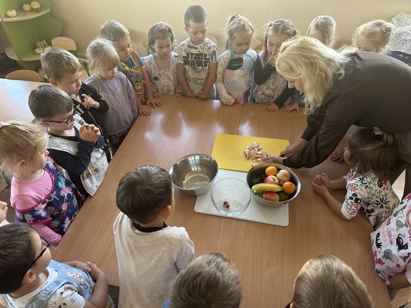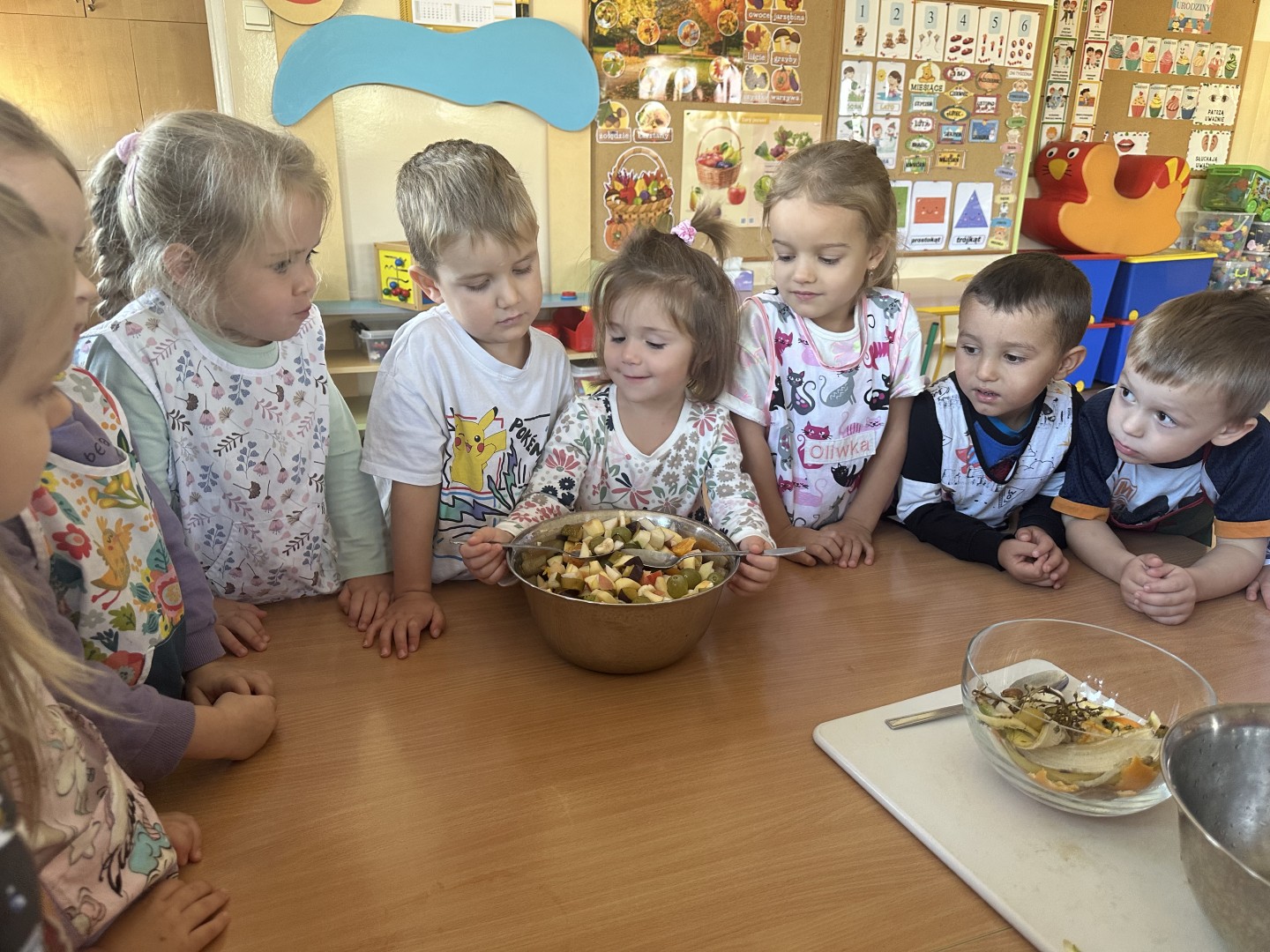 Dzieci z grupy „Kotki” na zajęciach przygotowały pyszną i zdrową sałatkę owocową. Owoców było bardzo dużo. Na stole znalazły się: jabłka, gruszki, banany, brzoskwinie, mandarynki, winogrona i śliwki. Wszyscy mieli soczyste minki na widok tak smakowitych owoców i każdy ochoczo zabrał się do pracy. Na początku dzieci poznały rodzaje owoców, te które występują w naszym kraju i owoce egzotyczne. Następnie rozmawialiśmy o tym co potrzebujemy do wykonania sałatki owocowej. Dokładnie umyliśmy ręce i owoce a następnie zabraliśmy się do pracy. Pani kroiła owoce, a dzieci wrzucały je do miski. Przyrządzenie sałatki dało dzieciom wiele satysfakcji, jednocześnie uświadamiając jak ważną rolę odgrywają witaminy we właściwym funkcjonowaniu organizmu. Sałatka wyszła wspaniale! Dzieci zrobioną przez siebie sałatkę zjadły z apetytem.