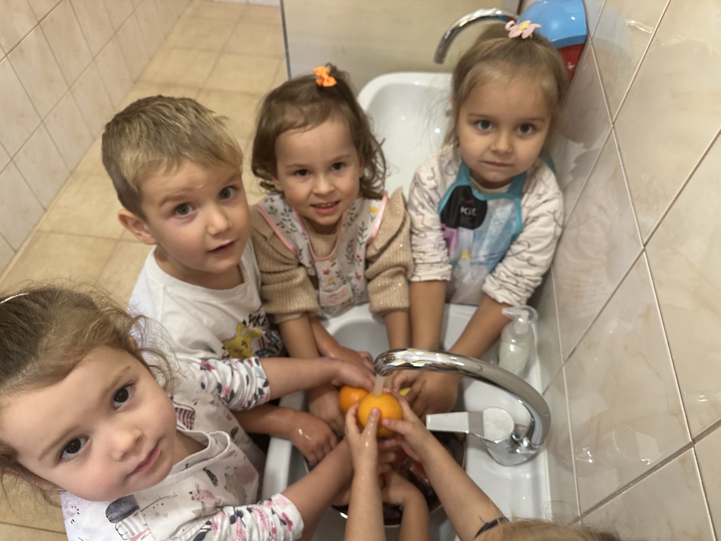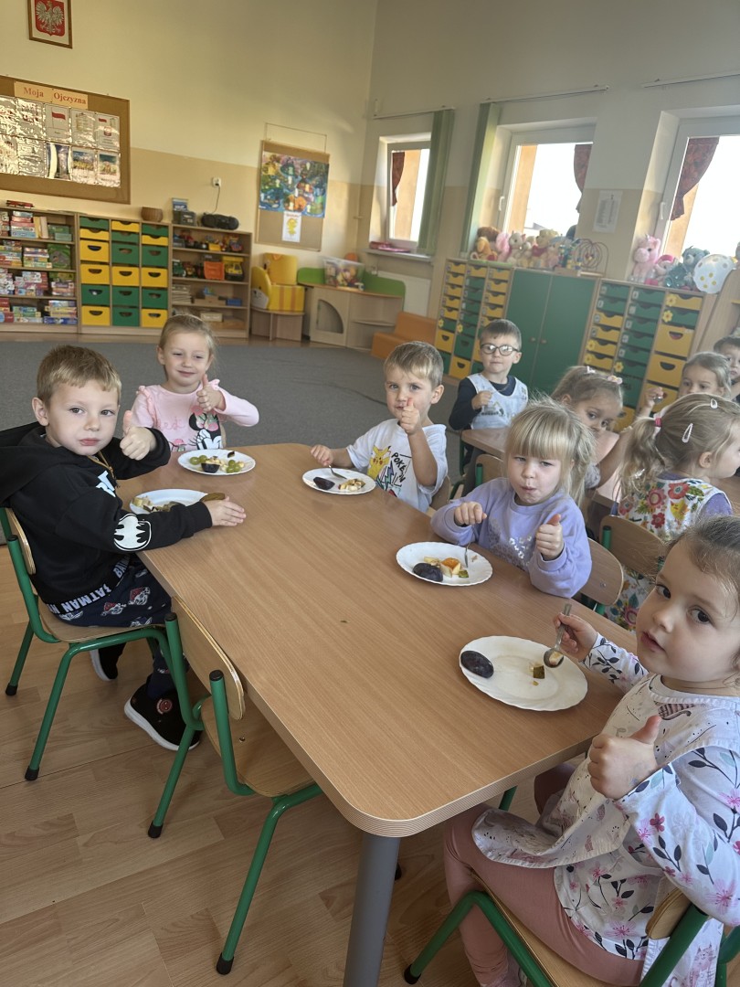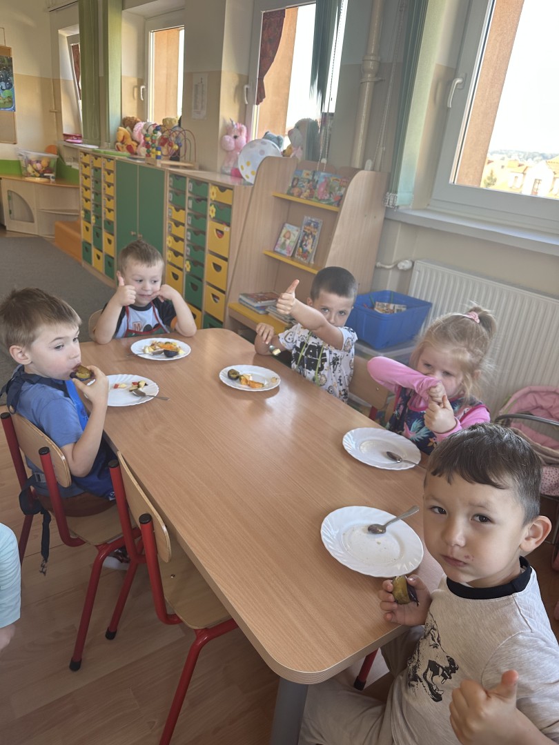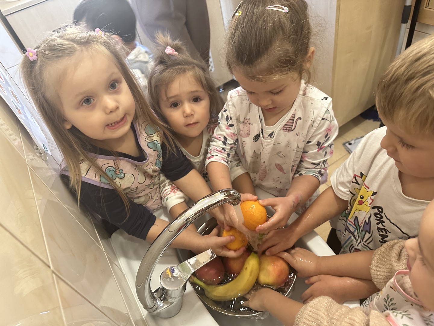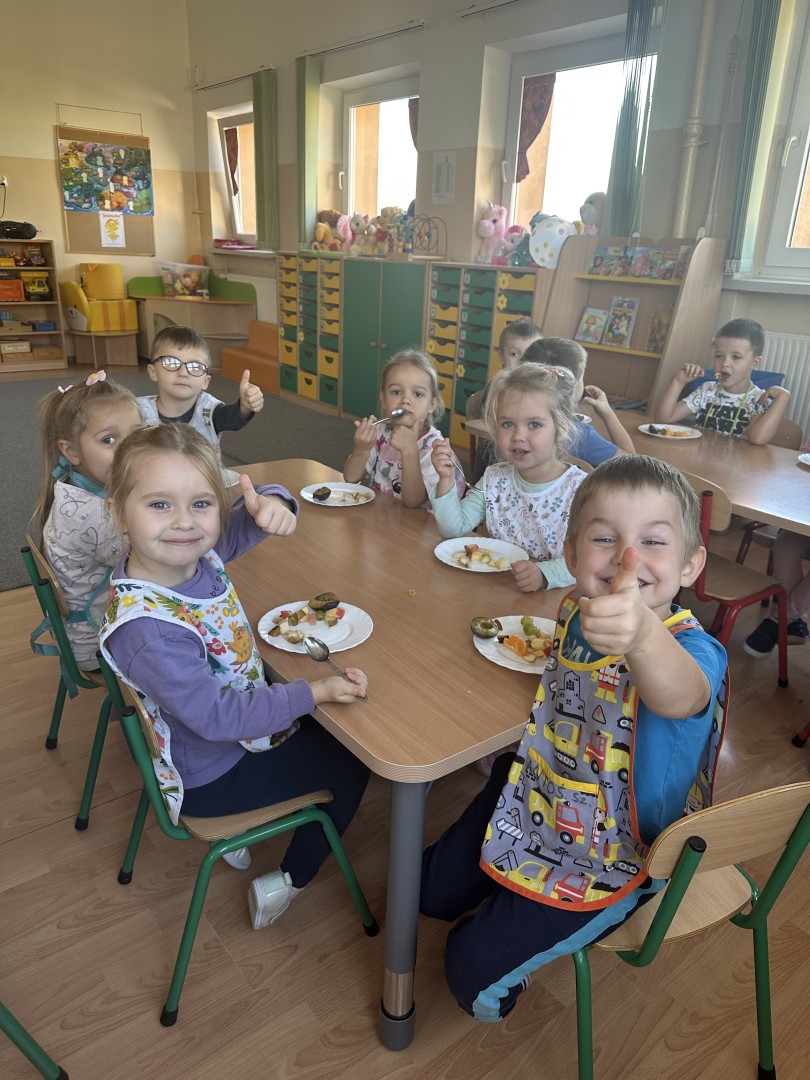 Dzieci z grupy „Kotki” na zajęciach przygotowały pyszną i zdrową sałatkę owocową. Owoców było bardzo dużo. Na stole znalazły się: jabłka, gruszki, banany, brzoskwinie, mandarynki, winogrona i śliwki. Wszyscy mieli soczyste minki na widok tak smakowitych owoców i każdy ochoczo zabrał się do pracy. Na początku dzieci poznały rodzaje owoców, te które występują w naszym kraju i owoce egzotyczne. Następnie rozmawialiśmy o tym co potrzebujemy do wykonania sałatki owocowej. Dokładnie umyliśmy ręce i owoce a następnie zabraliśmy się do pracy. Pani kroiła owoce, a dzieci wrzucały je do miski. Przyrządzenie sałatki dało dzieciom wiele satysfakcji, jednocześnie uświadamiając jak ważną rolę odgrywają witaminy we właściwym funkcjonowaniu organizmu. Sałatka wyszła wspaniale! Dzieci zrobioną przez siebie sałatkę zjadły z apetytem.