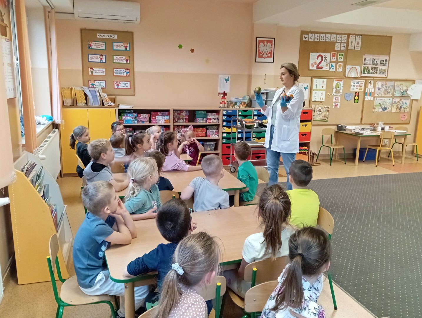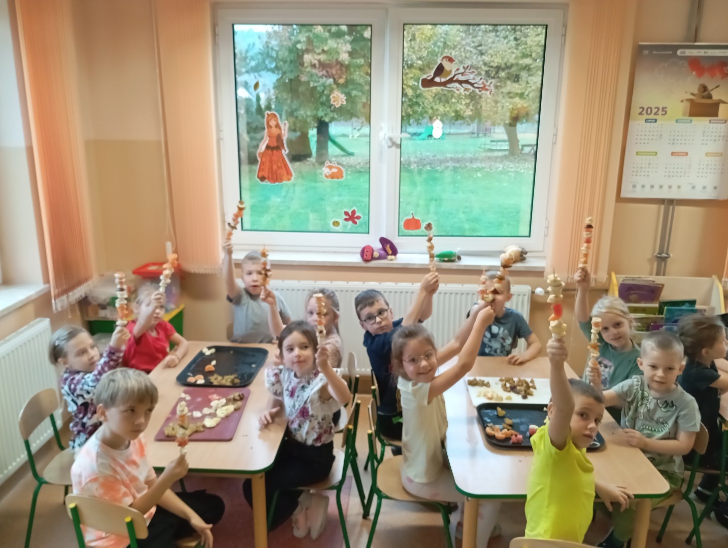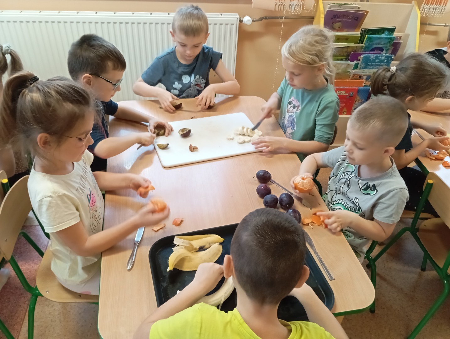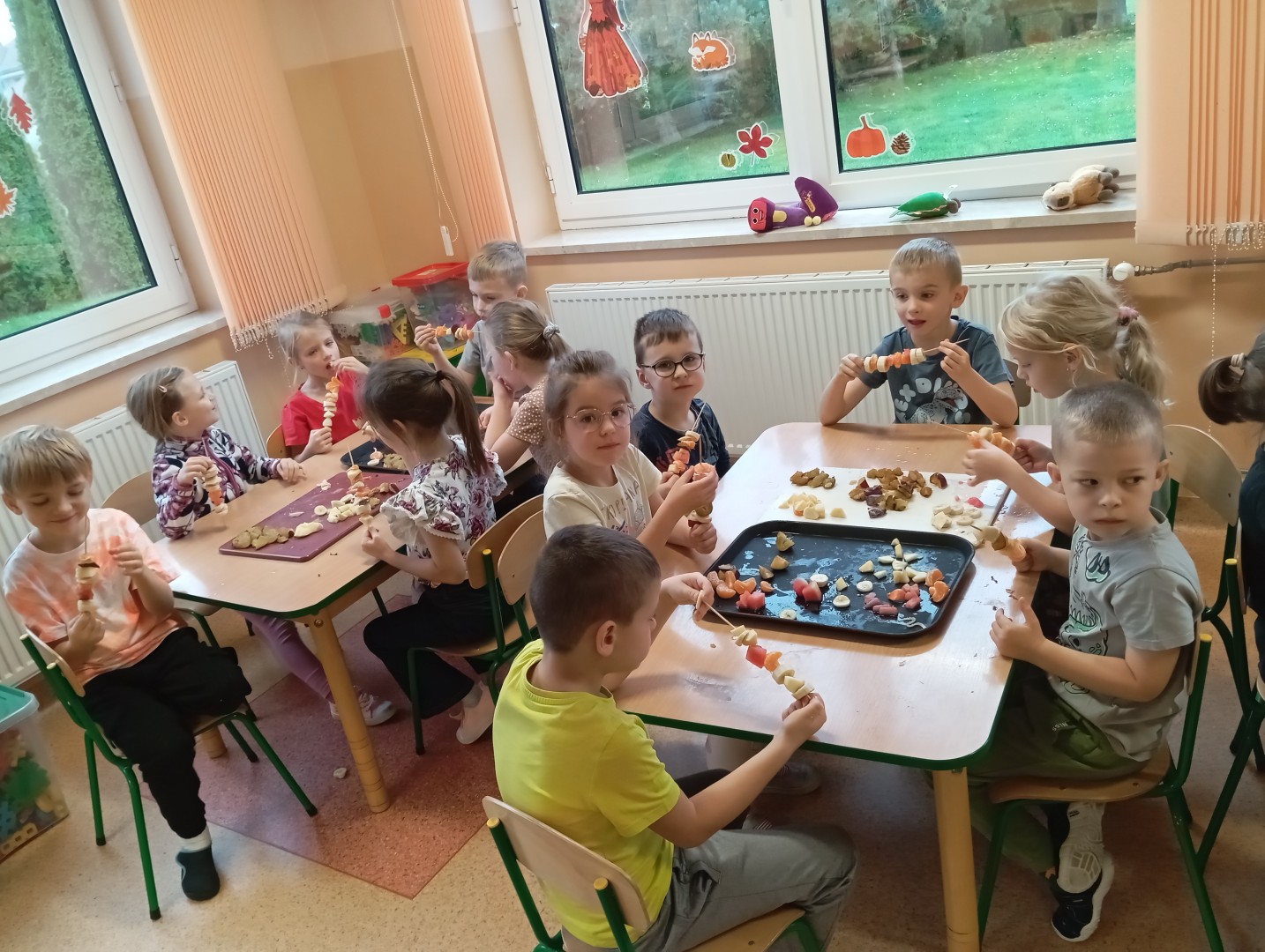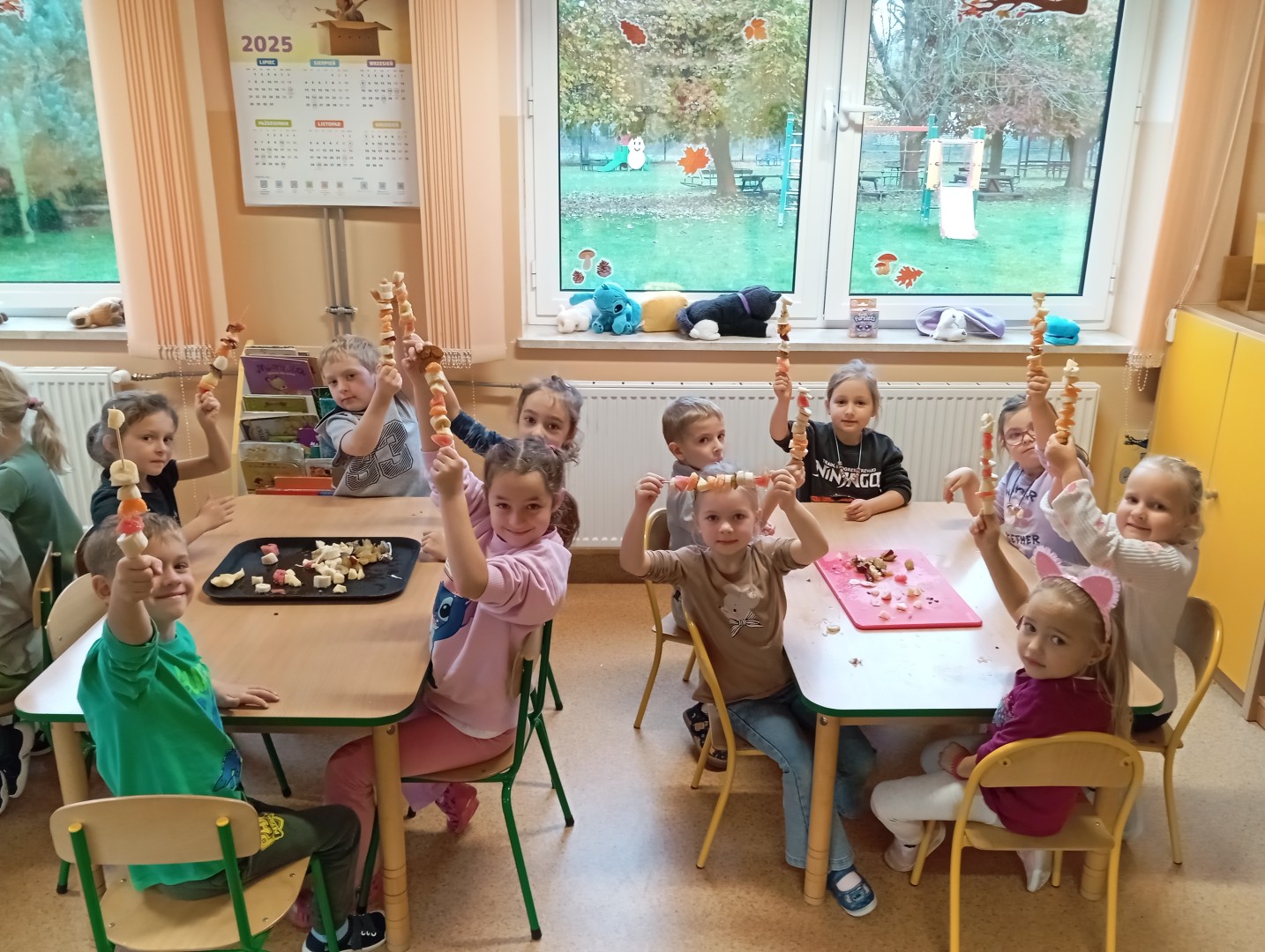 Podczas spotkania z naszą panią intendentką rozmawialiśmy o znaczeniu owoców w codziennej diecie oraz o tym, dlaczego warto wybierać je jako zdrową przekąskę. Dzieci dowiedziały się, jakie witaminy i składniki odżywcze kryją się w różnych owocach oraz jak wpływają one na nasze zdrowie, energię i samopoczucie. Uczestnicy wzieli udział w warsztatach kulinarnych, podczas których przygotowywali kolorowe szaszłyki owocowe. Wspólne przygotowywanie przekąsek zachęciło dzieci do samodzielnego sięgania po owoce.
