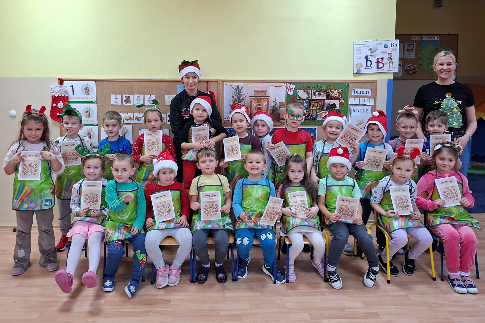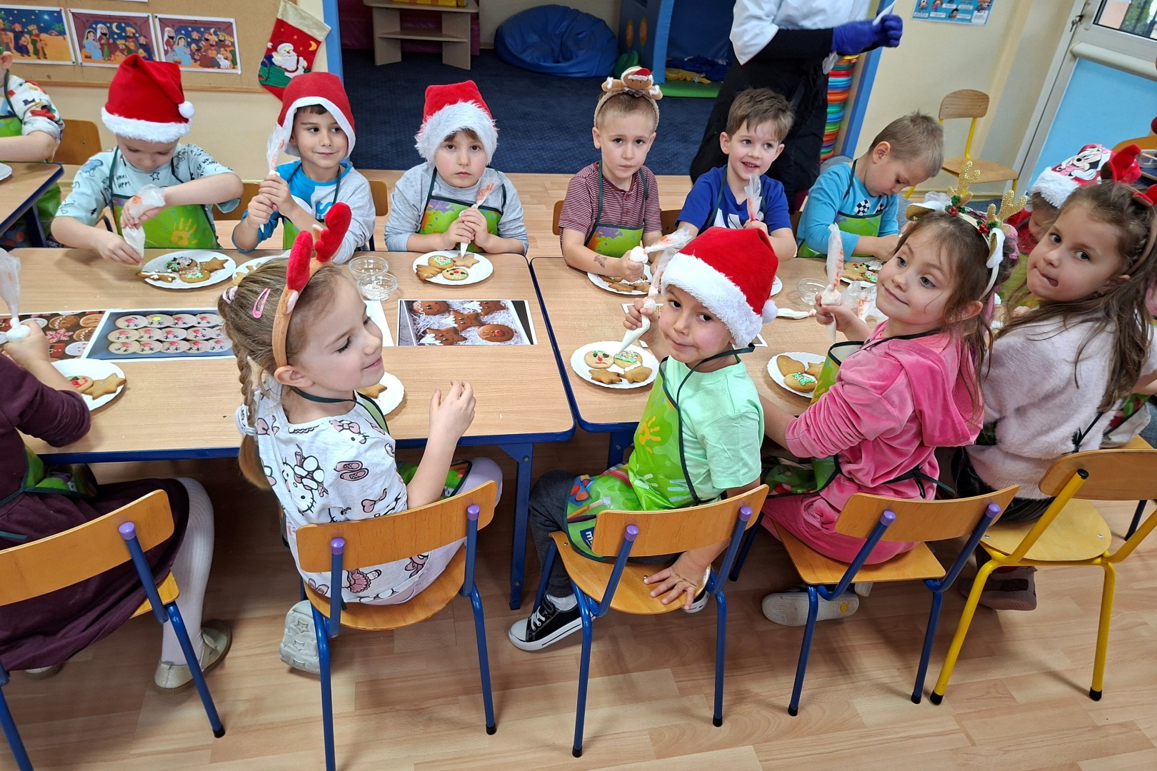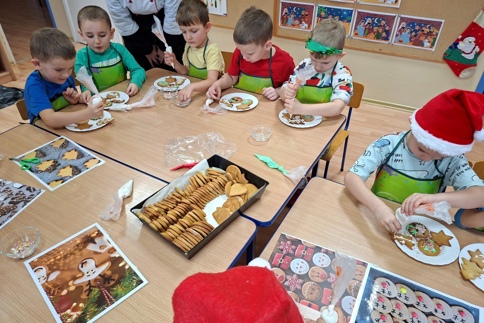 W naszym przedszkolu odbyły się wyjątkowe, pachnące świętami warsztaty wyrabiania i zdobienia pierniczków. Zajęcia poprowadziła Pani Justyna Szela – mama Janka, za co serdecznie dziękujemy. Na początku dzieci poznały produkty potrzebne do przygotowania piernikowego ciasta oraz dowiedziały się, jak powstają pierniczki. Następnie z wielkim zaangażowaniem wyrabiały ciasto, ćwicząc przy tym sprawność rąk i współpracę w grupie. Kolejnym etapem było dekorowanie pierniczków – dzieci z radością ozdabiały je lukrem i kolorowymi posypkami, rozwijając swoją kreatywność i wyobraźnię. Na zakończenie warsztatów każdy przedszkolak otrzymał pamiątkowy dyplom, który był miłym podsumowaniem wspólnej zabawy i pracy. Warsztaty sprawiły dzieciom wiele radości i wprowadziły wszystkich w świąteczny nastrój.