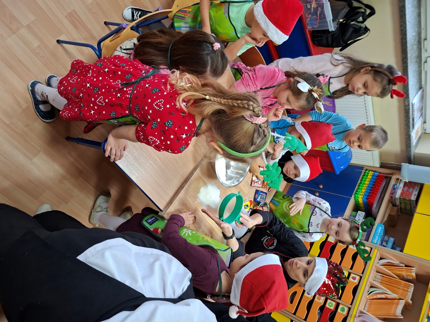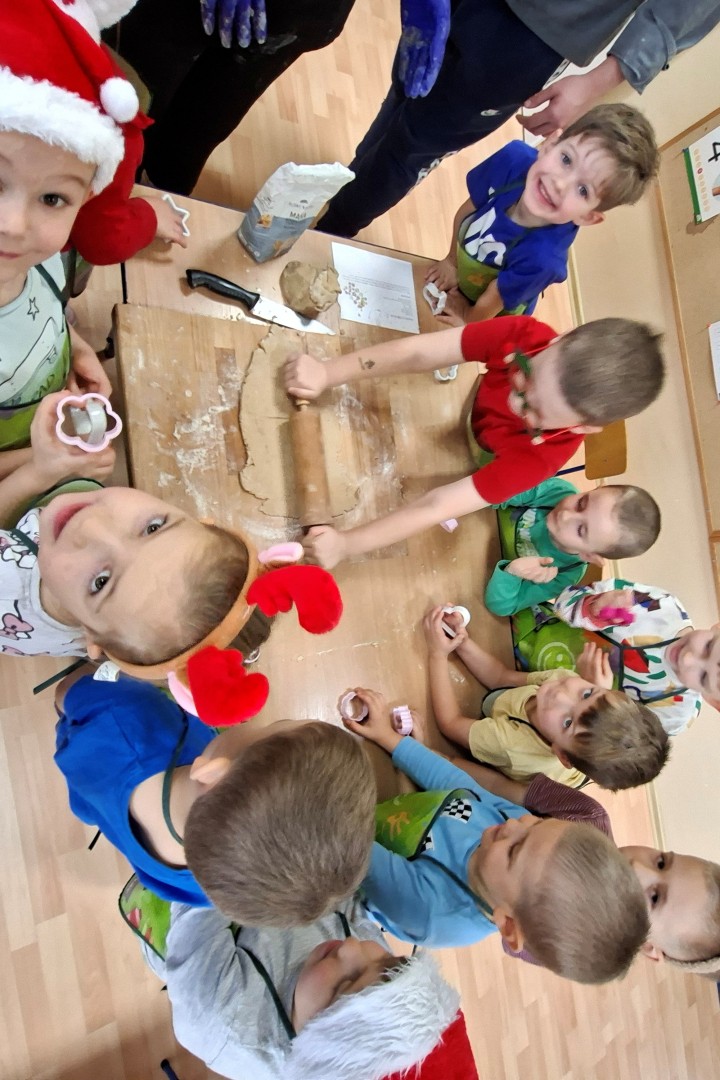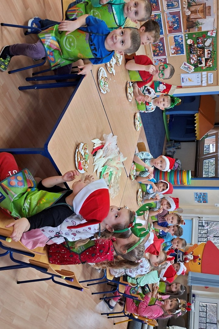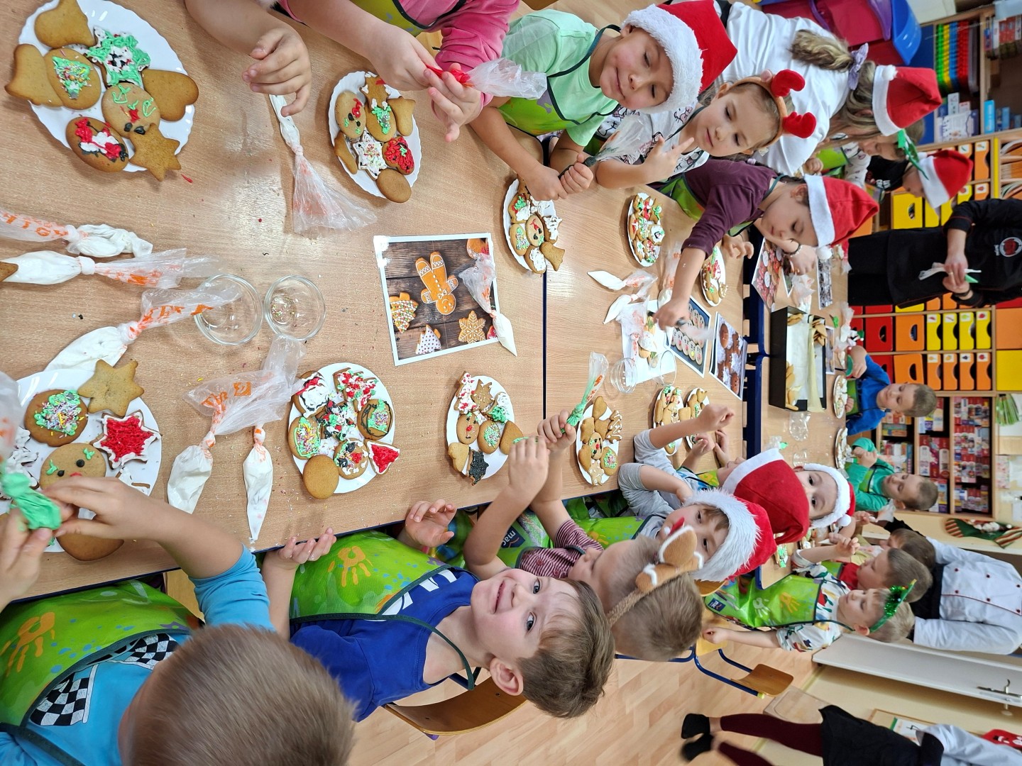 W naszym przedszkolu odbyły się wyjątkowe, pachnące świętami warsztaty wyrabiania i zdobienia pierniczków. Zajęcia poprowadziła Pani Justyna Szela – mama Janka, za co serdecznie dziękujemy. Na początku dzieci poznały produkty potrzebne do przygotowania piernikowego ciasta oraz dowiedziały się, jak powstają pierniczki. Następnie z wielkim zaangażowaniem wyrabiały ciasto, ćwicząc przy tym sprawność rąk i współpracę w grupie. Kolejnym etapem było dekorowanie pierniczków – dzieci z radością ozdabiały je lukrem i kolorowymi posypkami, rozwijając swoją kreatywność i wyobraźnię. Na zakończenie warsztatów każdy przedszkolak otrzymał pamiątkowy dyplom, który był miłym podsumowaniem wspólnej zabawy i pracy. Warsztaty sprawiły dzieciom wiele radości i wprowadziły wszystkich w świąteczny nastrój.