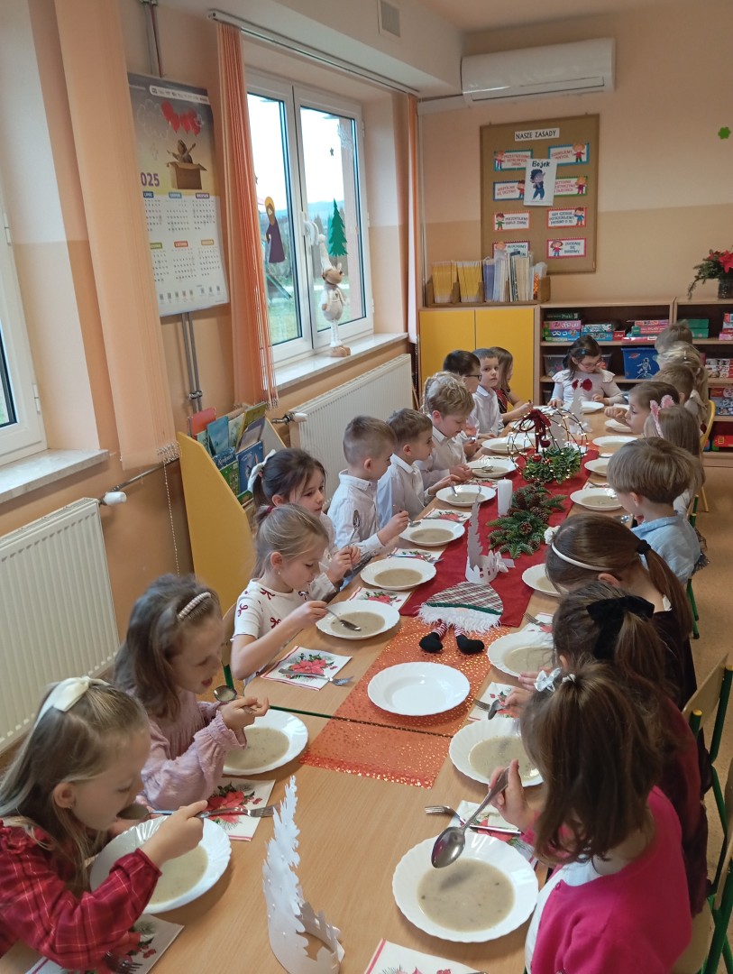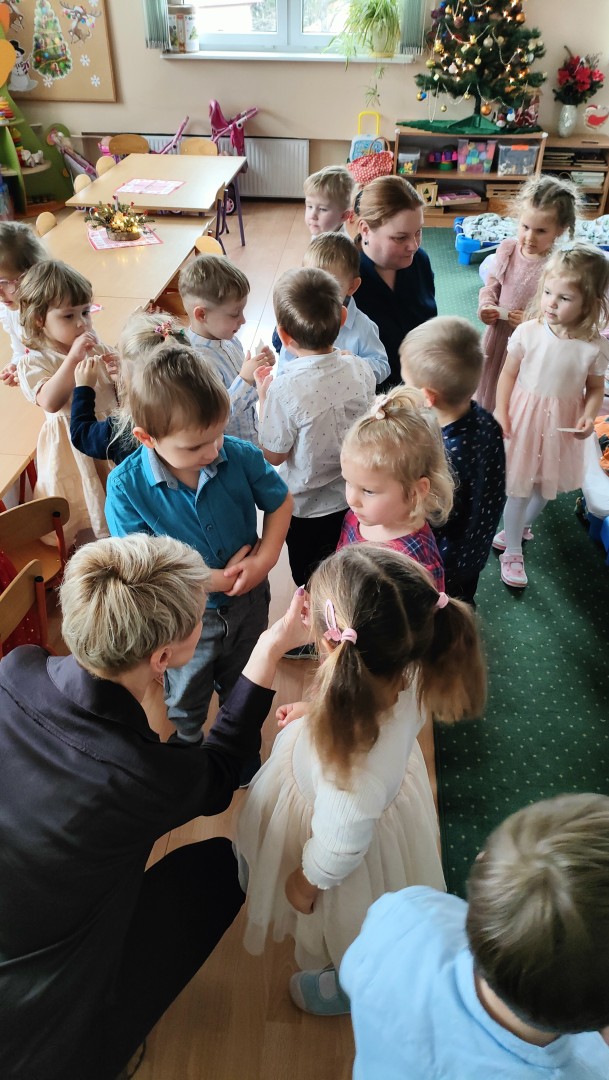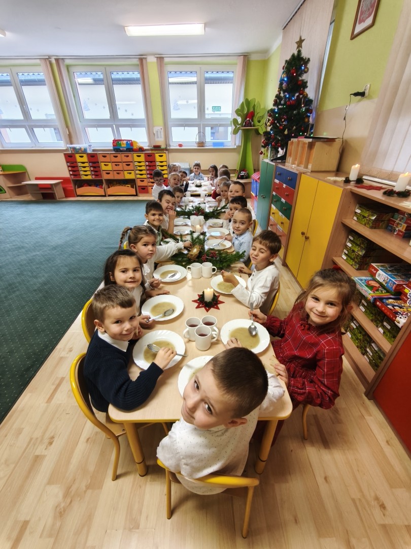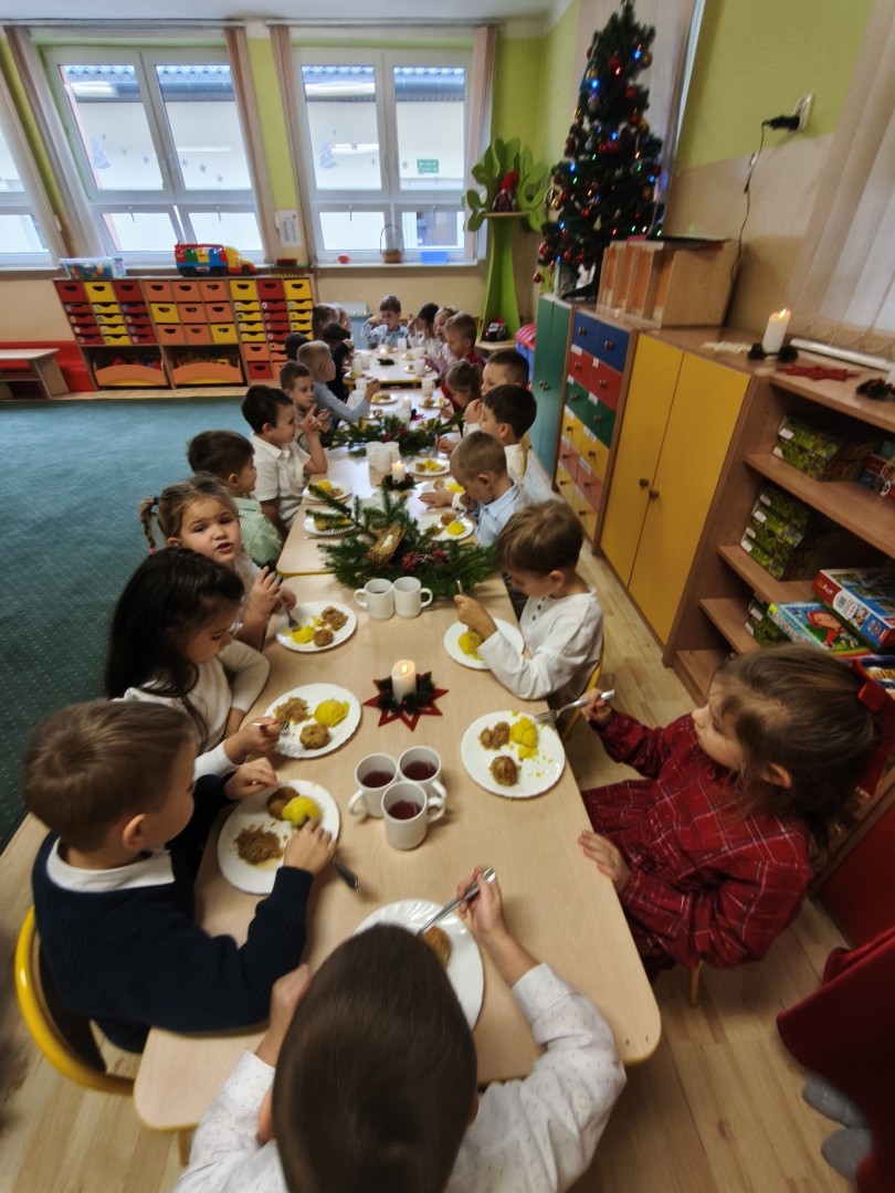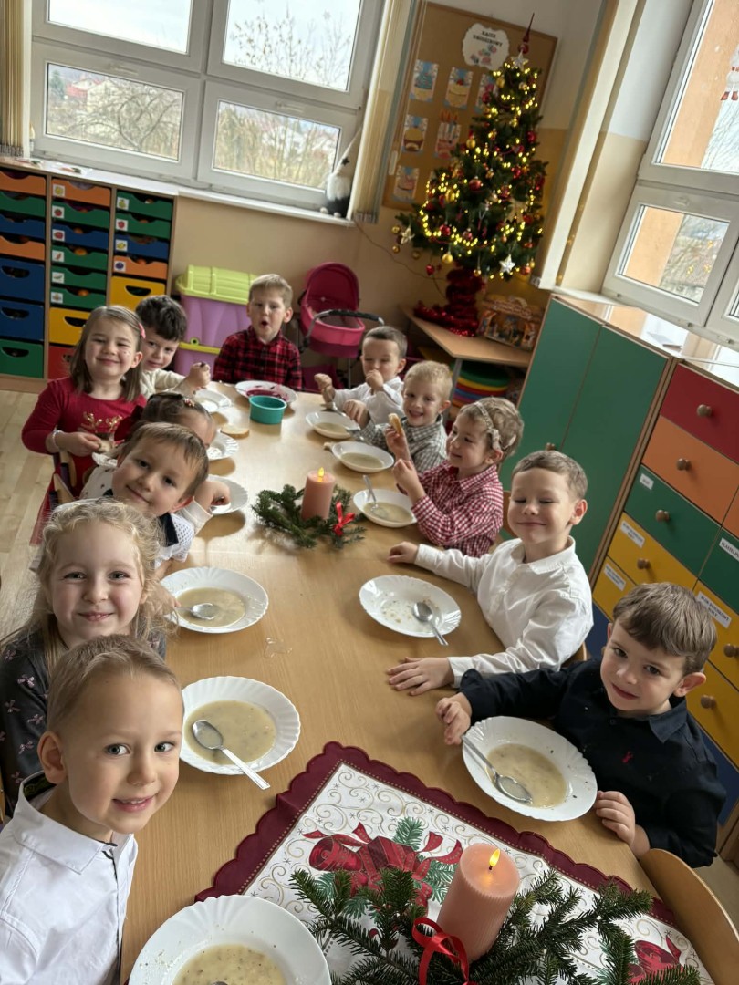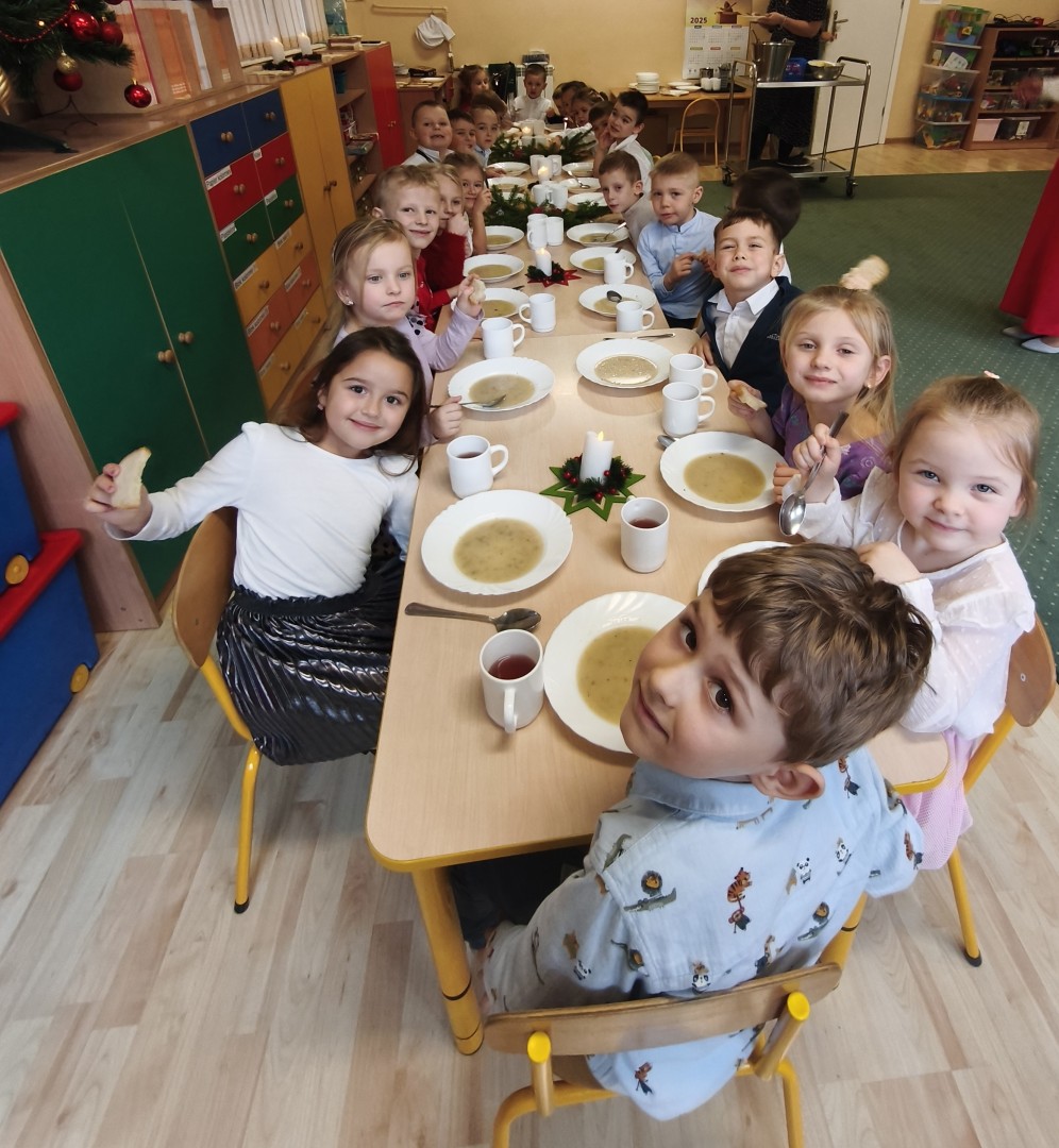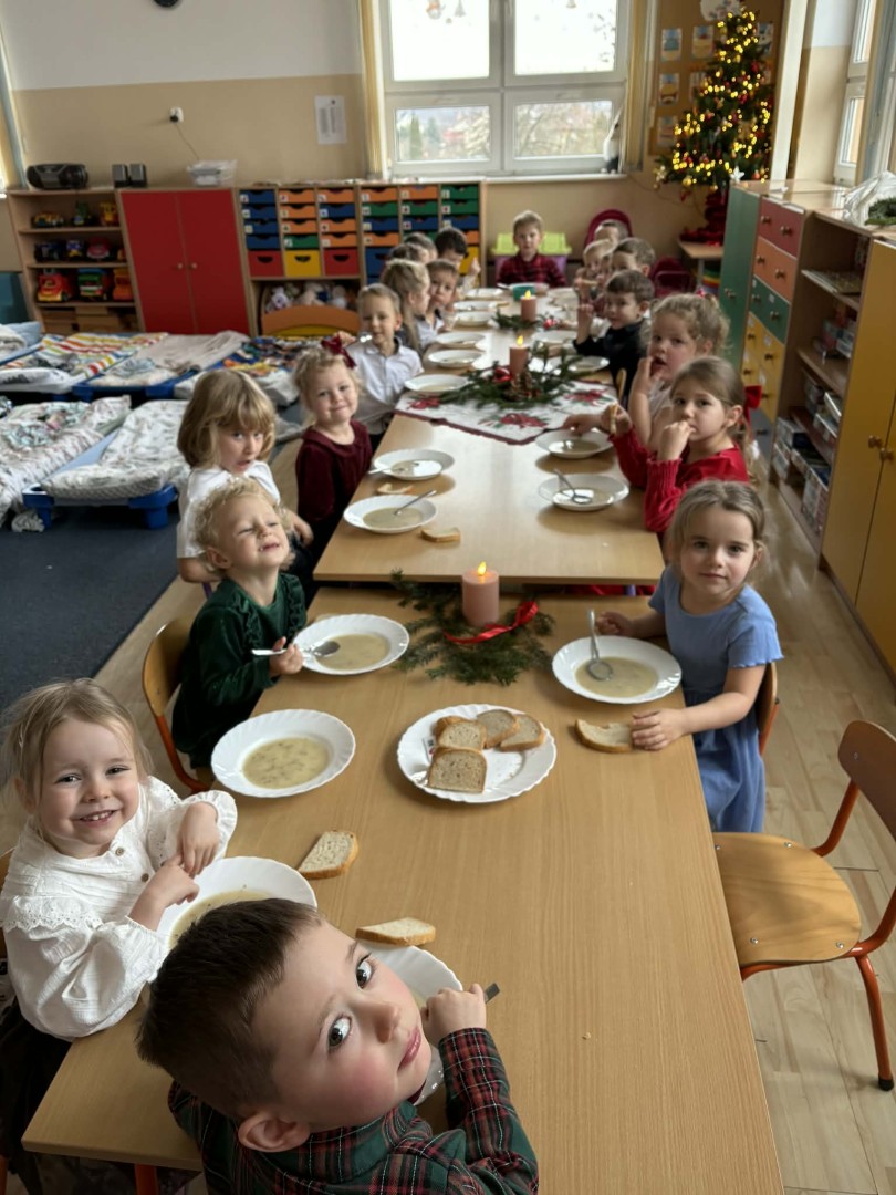 Dnia 19.12.2025 r. w naszym przedszkolu odbyła się Wigilia Bożego Narodzenia. Tradycyjnie uroczystość rozpoczęła się od Jasełek wystawionych przez dzieci. W salach przedszkolnych przedszkolaki dzieliły się opłatkiem, składały sobie życzenia, a następnie zasiadły do pięknie przystrojonych stołów, na których czekał świąteczny obiad. Wspólne kolędowanie wprawiło wszystkich w uroczysty i świąteczny nastrój.