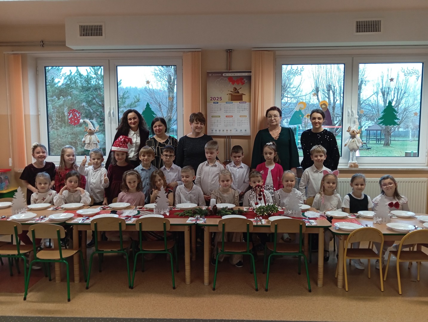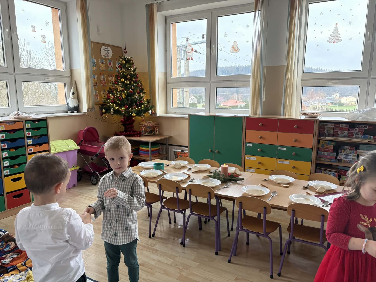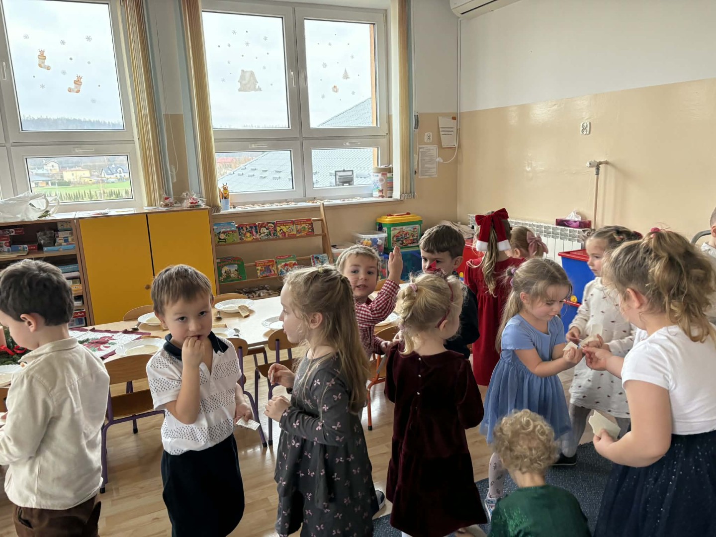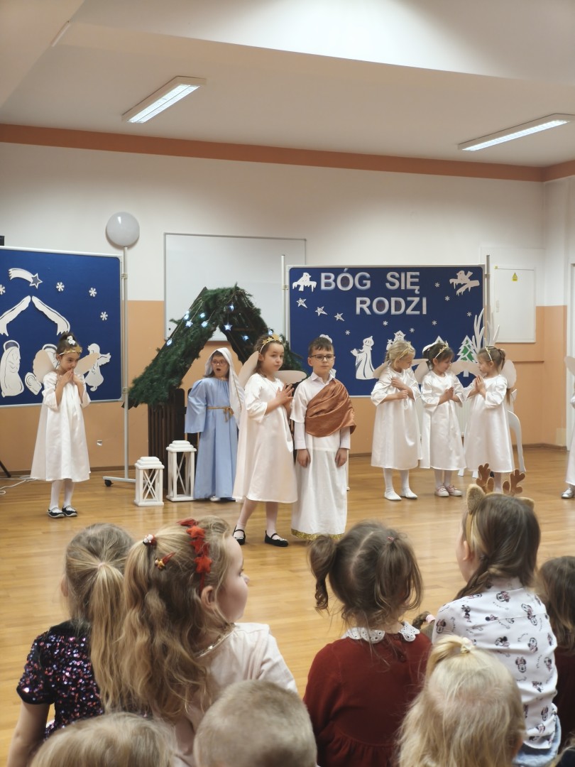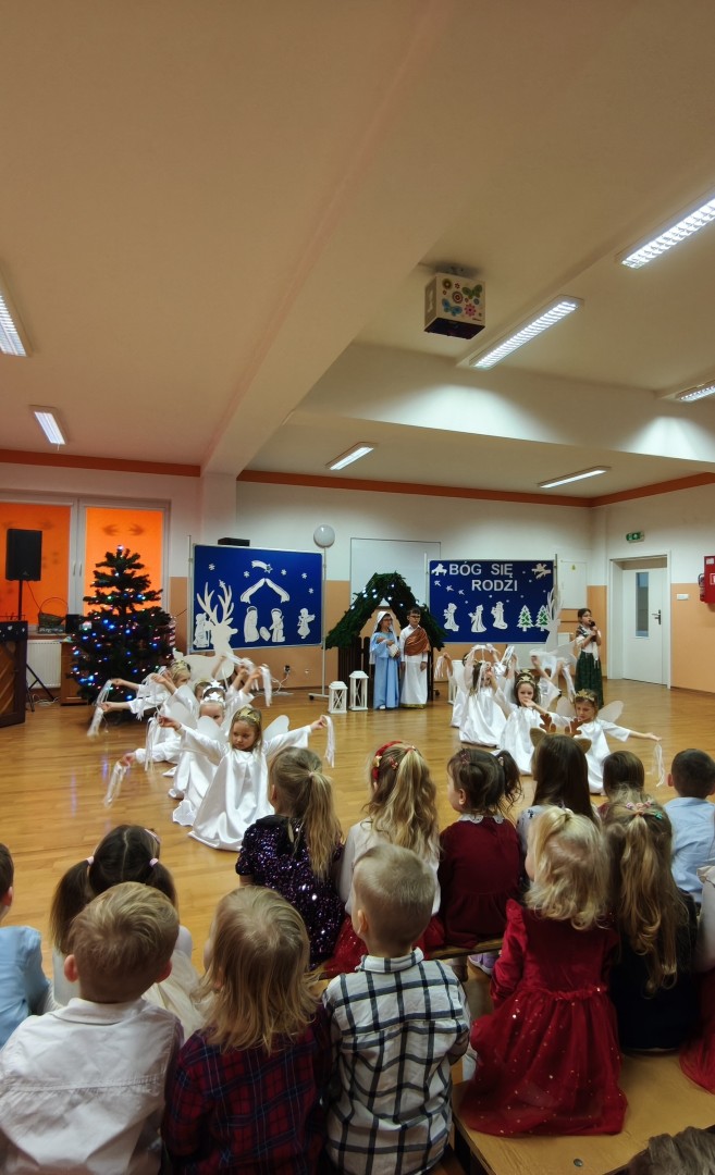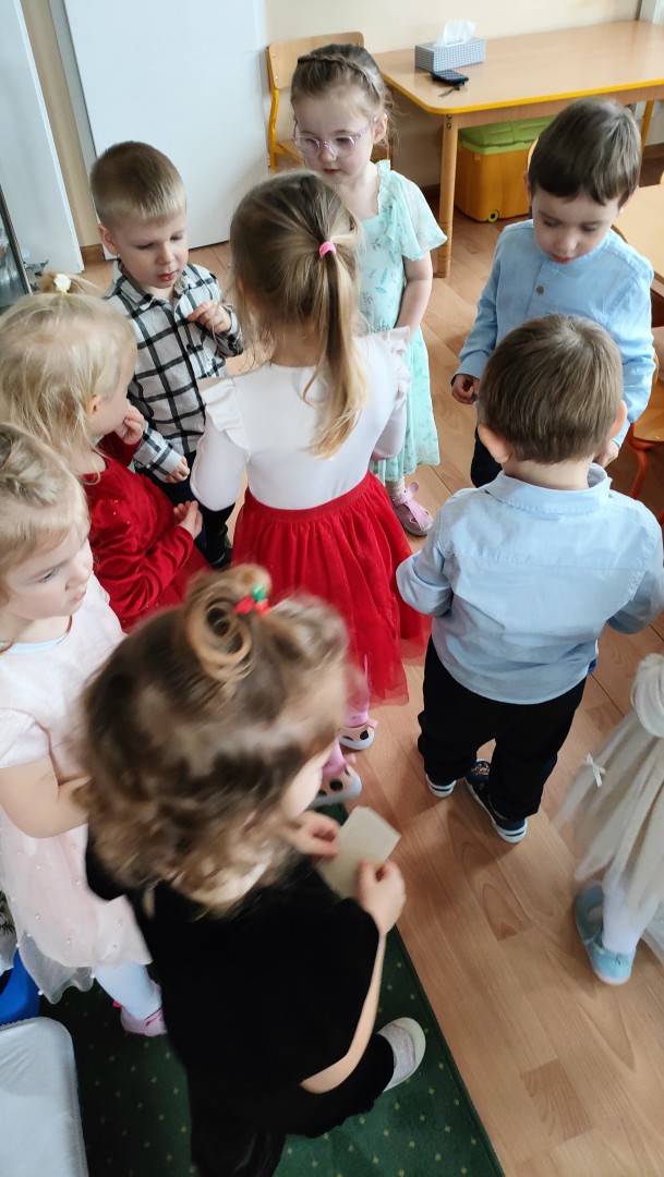 Dnia 19.12.2025 r. w naszym przedszkolu odbyła się Wigilia Bożego Narodzenia. Tradycyjnie uroczystość rozpoczęła się od Jasełek wystawionych przez dzieci. W salach przedszkolnych przedszkolaki dzieliły się opłatkiem, składały sobie życzenia, a następnie zasiadły do pięknie przystrojonych stołów, na których czekał świąteczny obiad. Wspólne kolędowanie wprawiło wszystkich w uroczysty i świąteczny nastrój.