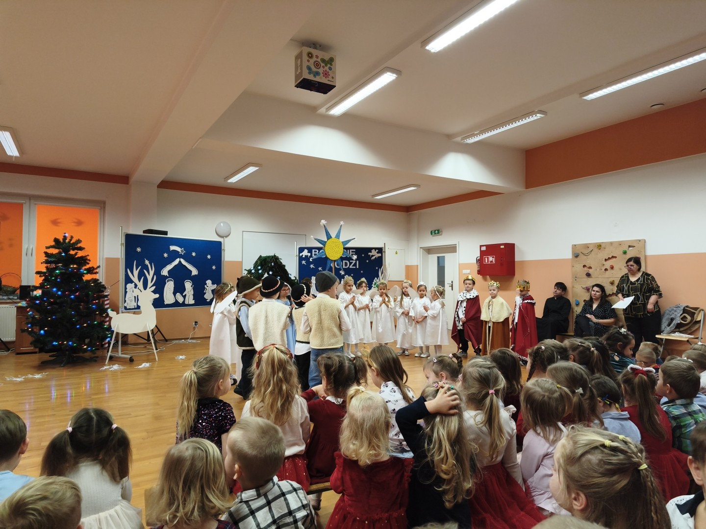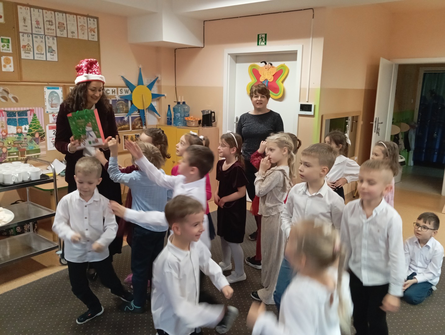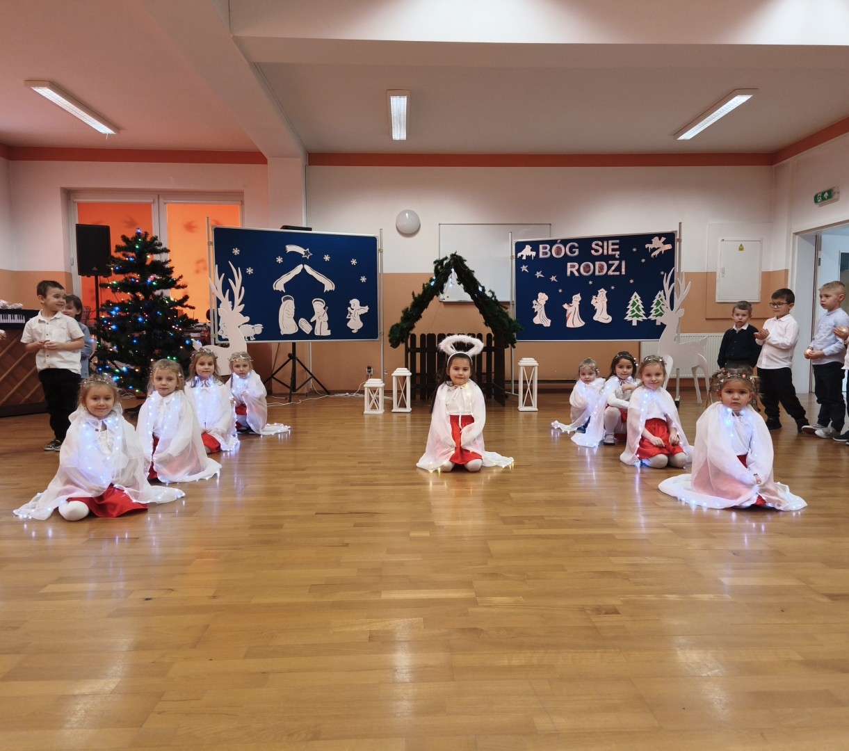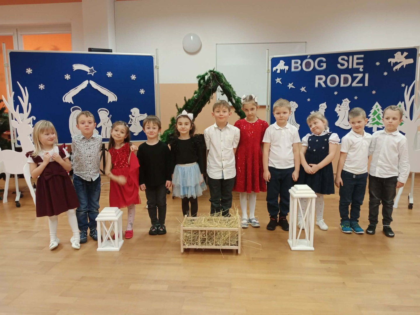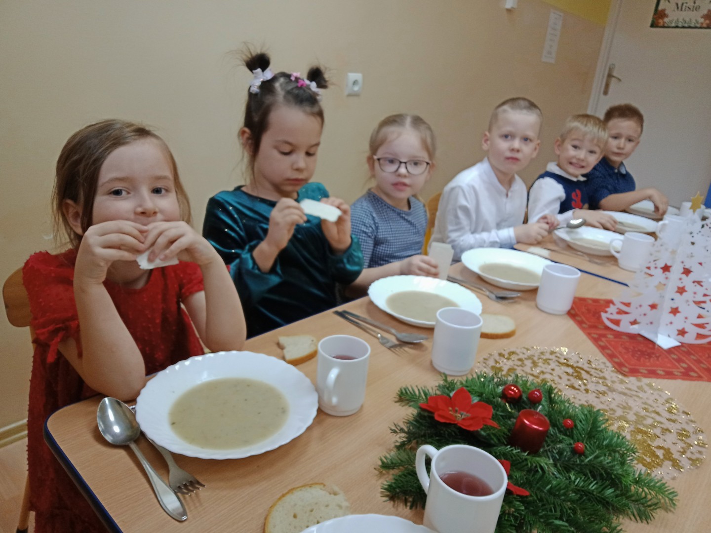 Dnia 19.12.2025 r. w naszym przedszkolu odbyła się Wigilia Bożego Narodzenia. Tradycyjnie uroczystość rozpoczęła się od Jasełek wystawionych przez dzieci. W salach przedszkolnych przedszkolaki dzieliły się opłatkiem, składały sobie życzenia, a następnie zasiadły do pięknie przystrojonych stołów, na których czekał świąteczny obiad. Wspólne kolędowanie wprawiło wszystkich w uroczysty i świąteczny nastrój.