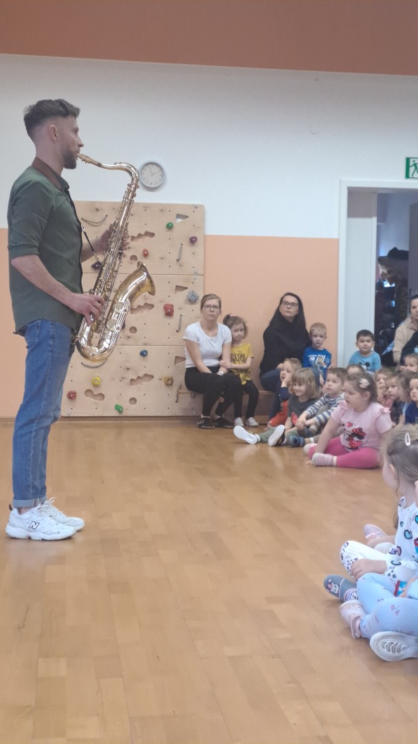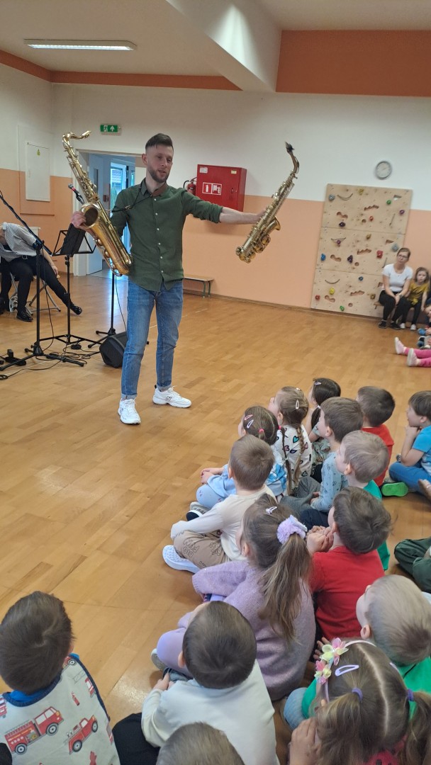 W ostatnim czasie sala ruchu w naszym przedszkolu zamieniła się w prawdziwe muzyczne królestwo! Odwiedziła nas grupa muzyczna z Filharmonii Podkarpackiej, która przygotowała dla dzieci niezwykłe spotkanie pełne dźwięków, zabawy i wspólnego odkrywania świata muzyki. Podczas występu rozbrzmiewały znane i lubiane melodie z bajek – zarówno tych klasycznych, jak i tych najnowszych, które dzieci oglądają na co dzień. Zadaniem przedszkolaków było rozpoznawanie utworów, a trzeba przyznać – spisały się na medal! Oprócz świetnej zabawy, dzieci dowiedziały się wielu ciekawostek o instrumentach i rytmach. Wszystko to w formie interaktywnej, angażującej i dopasowanej do wieku przedszkolaków. To było wyjątkowe wydarzenie, które na długo zostanie w naszej pamięci. Dziękujemy za niesamowitą atmosferę i już nie możemy się doczekać kolejnego spotkania!