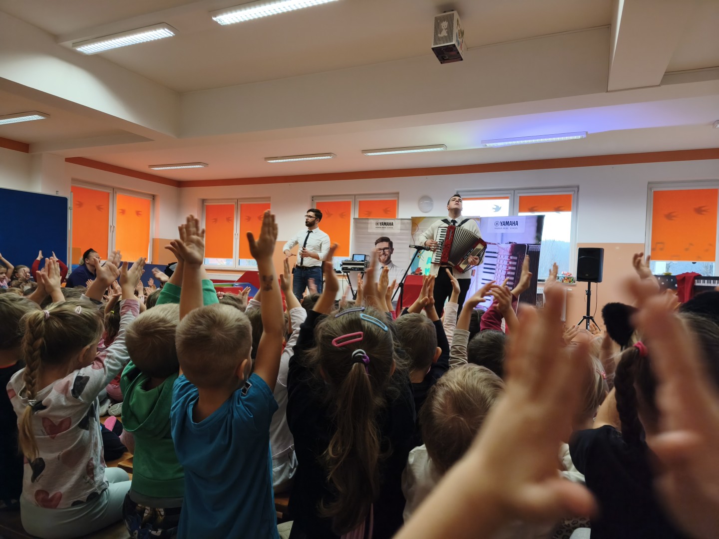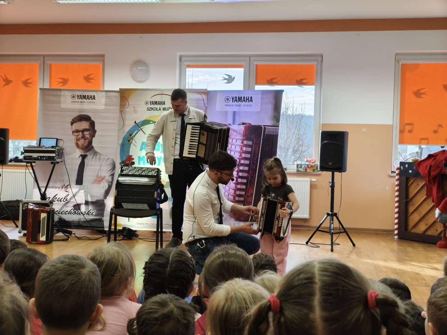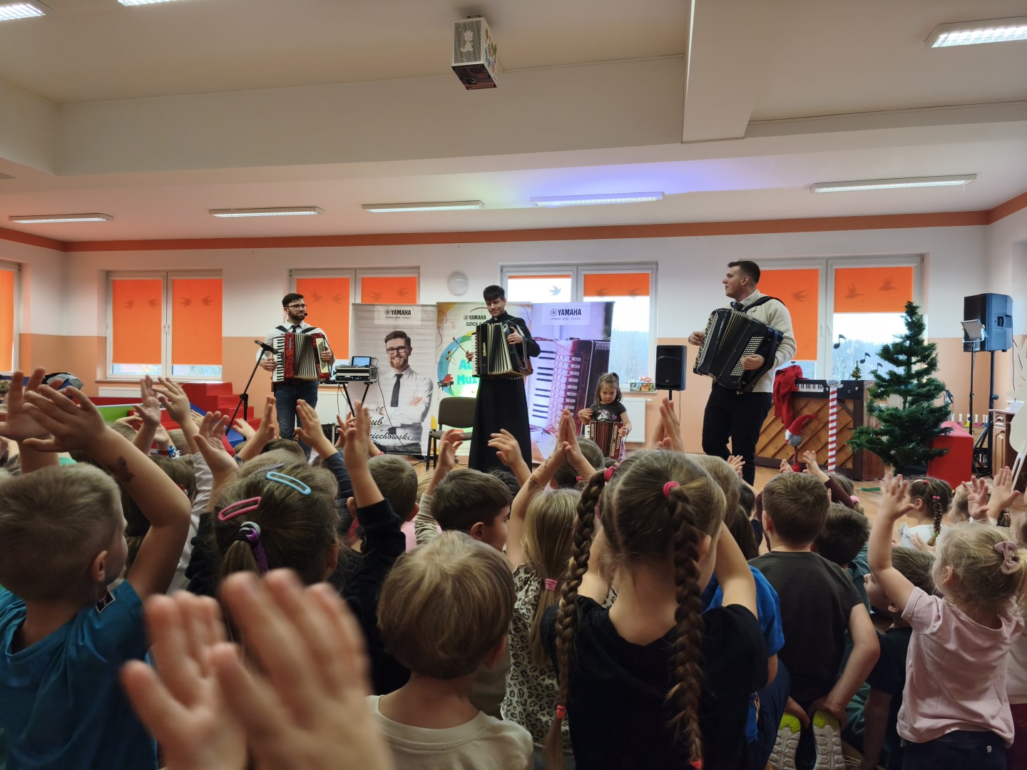 Dnia 10.12.2025r. w naszym przedszkolu odbyło się kolejne spotkanie z muzykami ze Szkoły Muzycznej Yamaha. Nasi goście porwali wszystkich do wesołej zabawy, a dzieci poznały takie instrumenty jak: akordeon, melodyka. Spotkanie przebiegło w radosnej i miłej atmosferze.