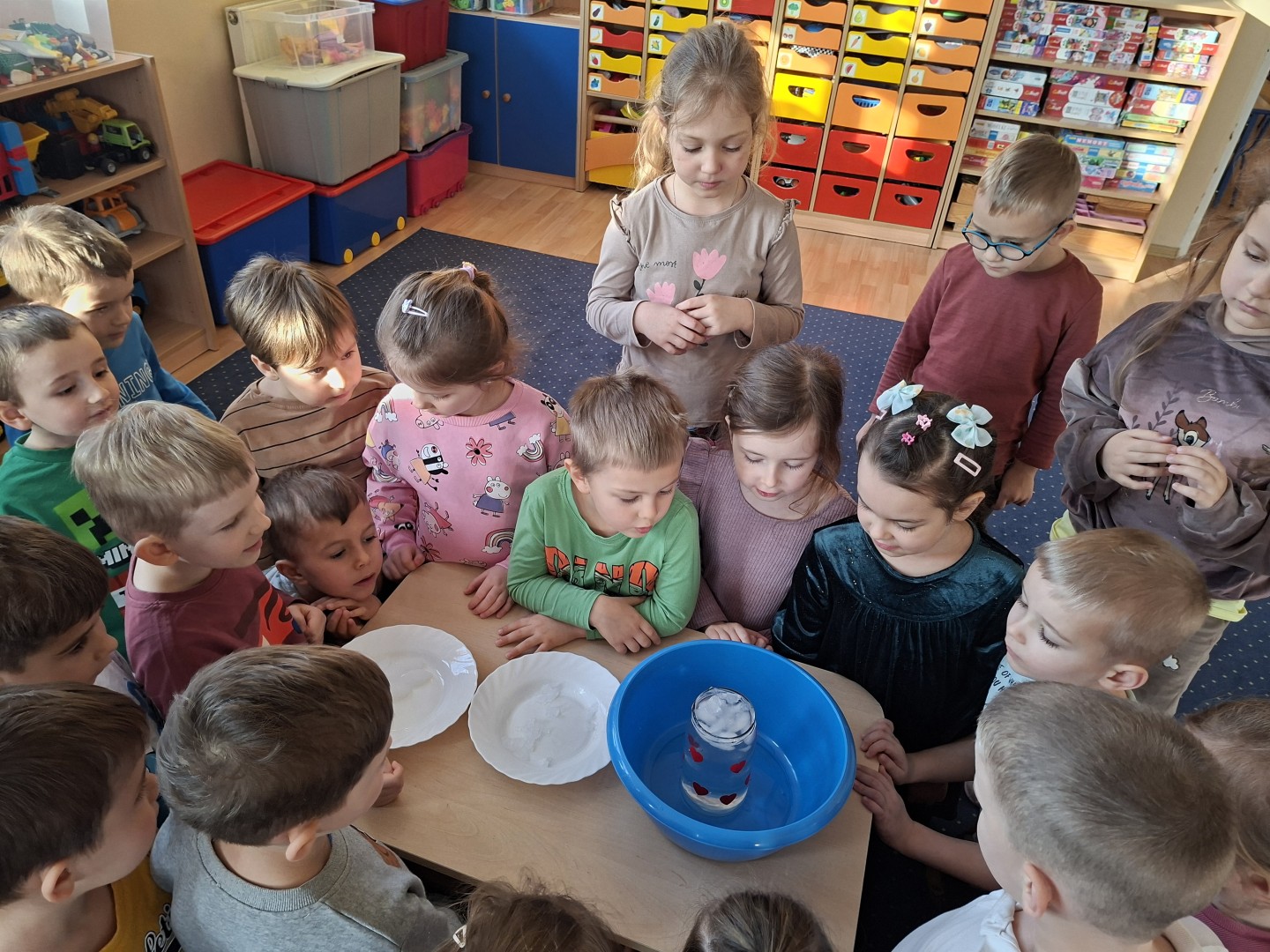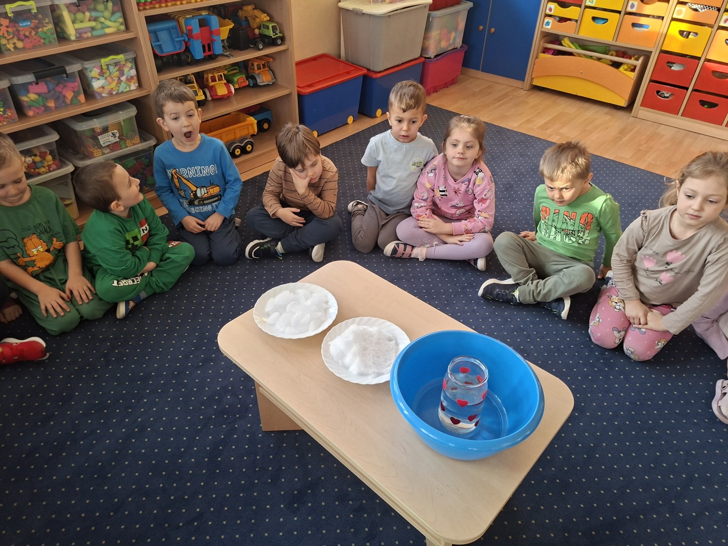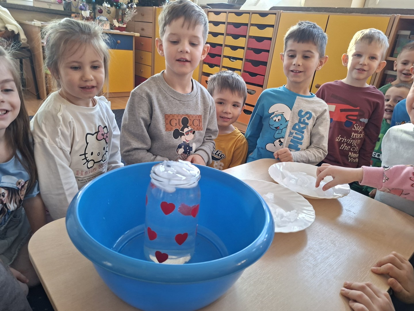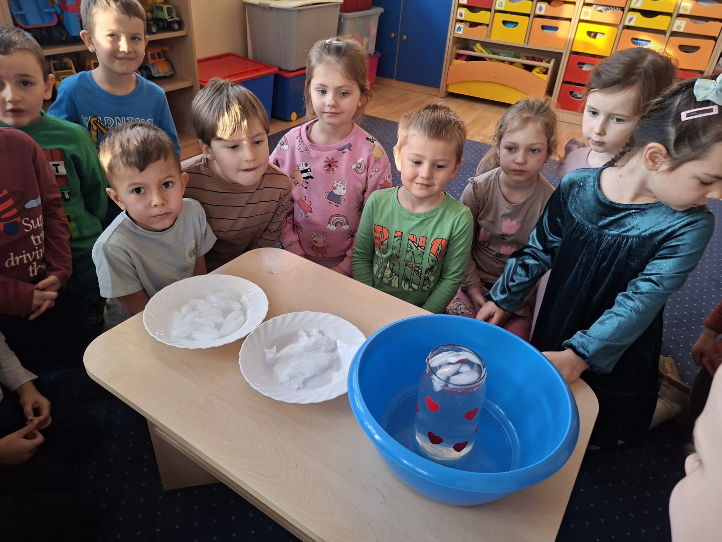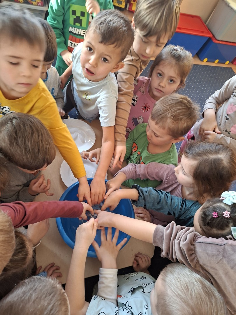 Podczas tygodniowych zajęć Misie uczestniczyły w ciekawych eksperymentach z wodą w różnych postaciach. Przedszkolaki badały śnieg, obserwując, jak powoli się rozpuszcza. Zauważyły, że po roztopieniu staje się wodą i że jest ona bardzo zanieczyszczona. Roztapialiśmy również lód i porównywaliśmy, jak zmienia się pod wpływem temperatury. Następnie dzieci obserwowały gorącą wodę – widziały, jak paruje, a potem para skrapla się na chłodnej powierzchni. Zajęcia były bardzo ciekawe i wzbudziły duże zainteresowanie u przedszkolaków.